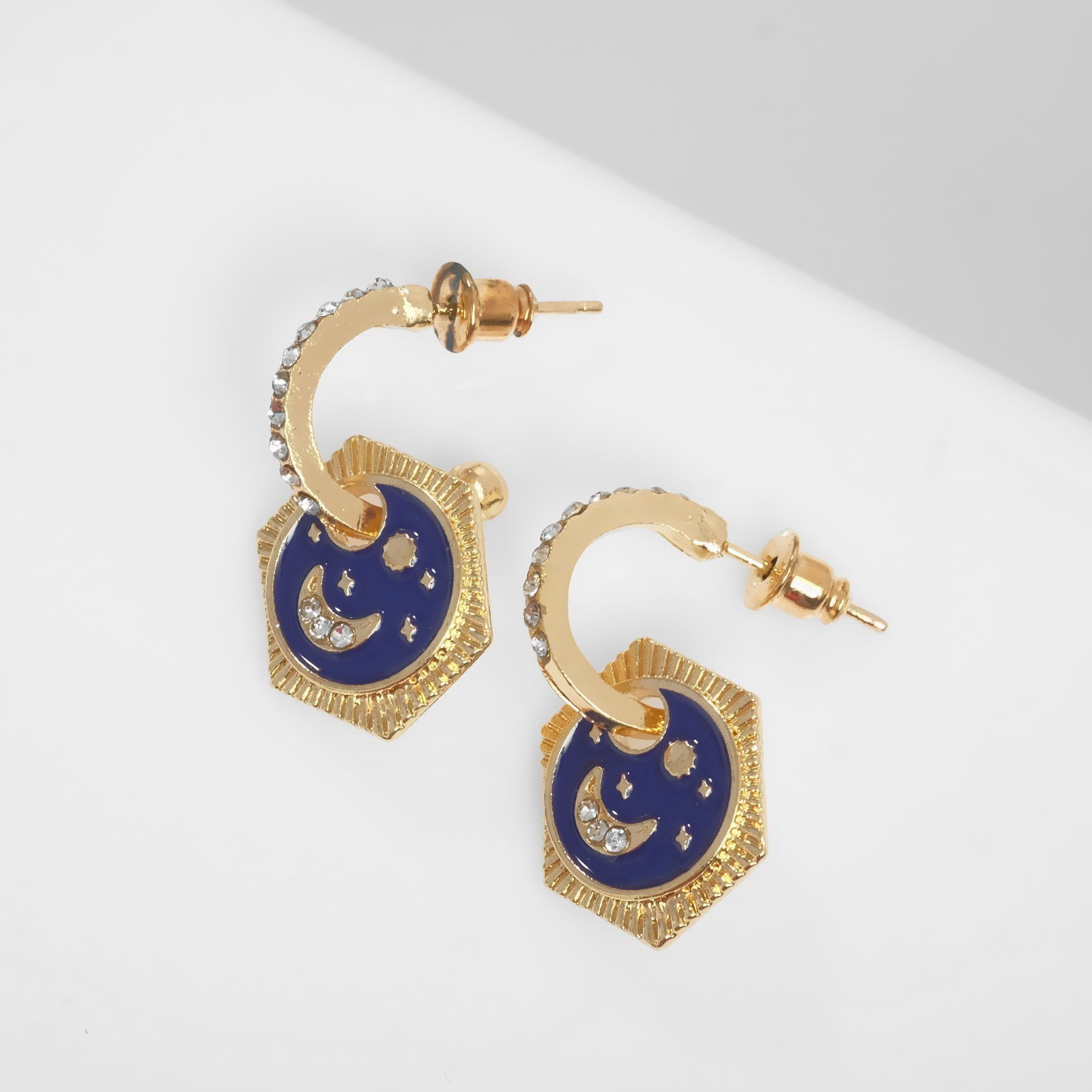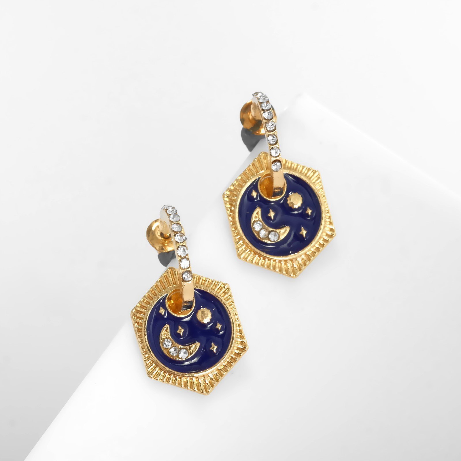 Серьги эмаль "Ночь" луна и звёзды, цвет бело-синий в золоте, 1.3x2.6x1.5 см., Queen fair, Китай