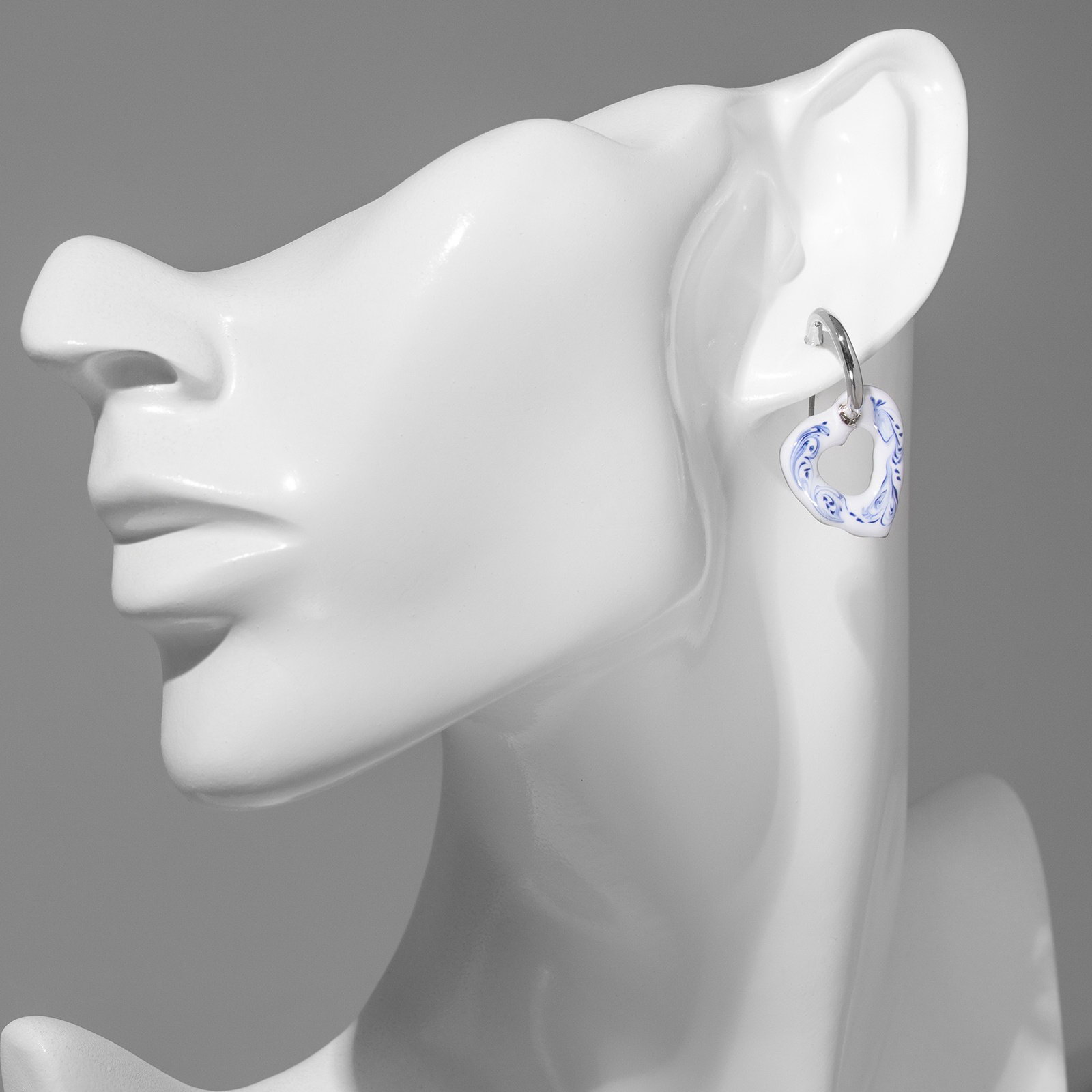 Серьги с эмалью "Сердце" разводы, цвет бело-синий в серебре, 1.8x3x2 см., QF, Китай