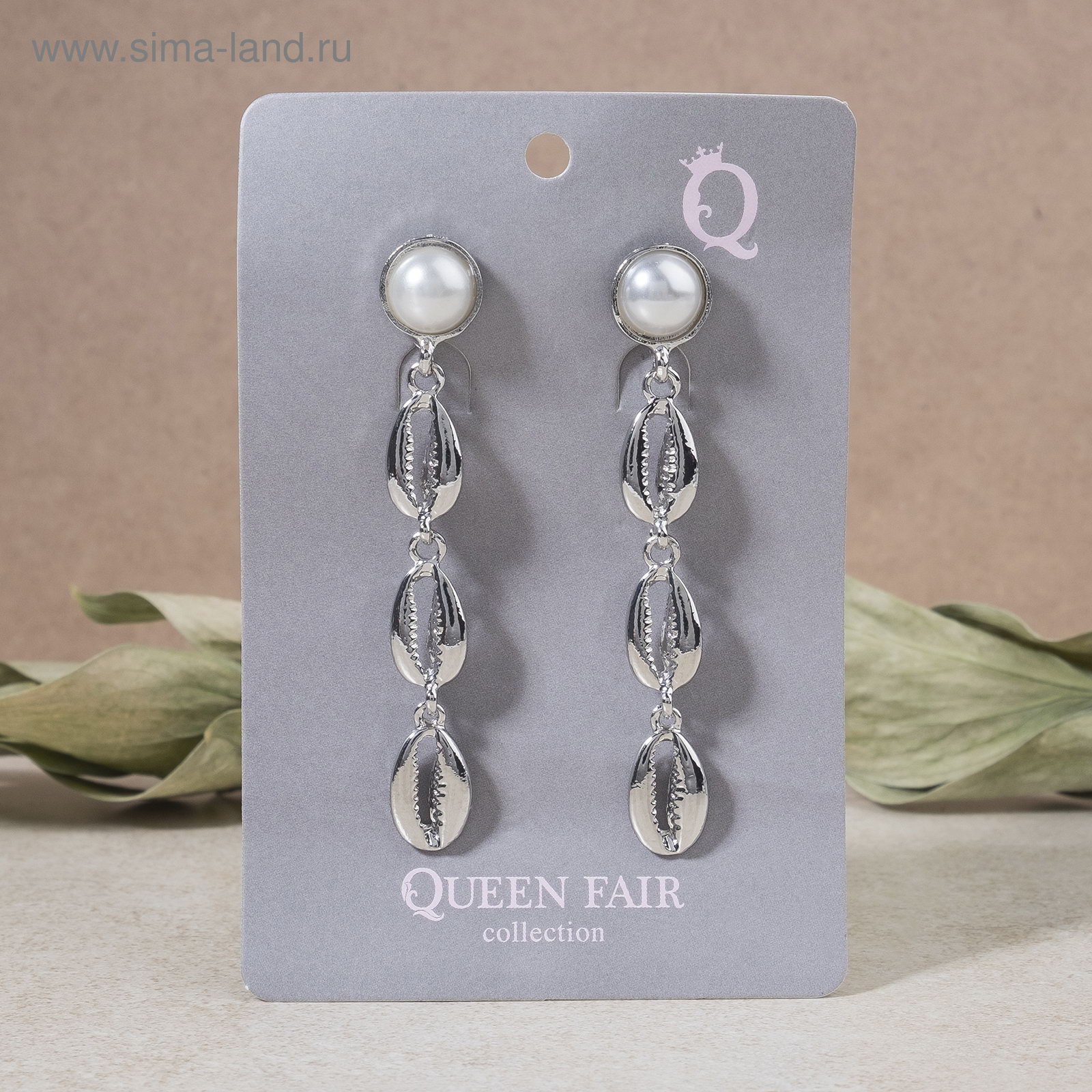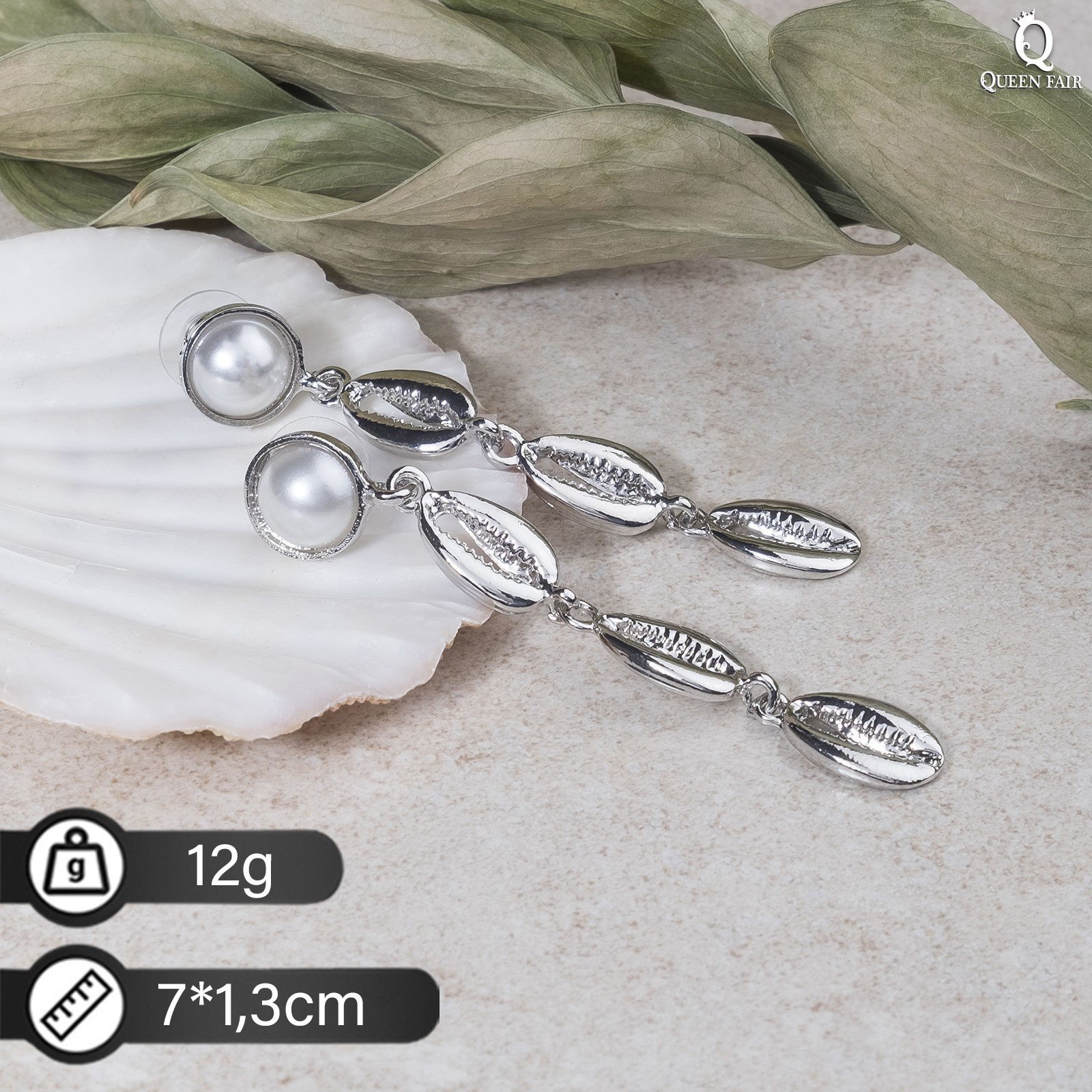 Серьги с жемчугом "Ракушки", белые в серебре, 1.3x7x0.7 см., QF, Китай
