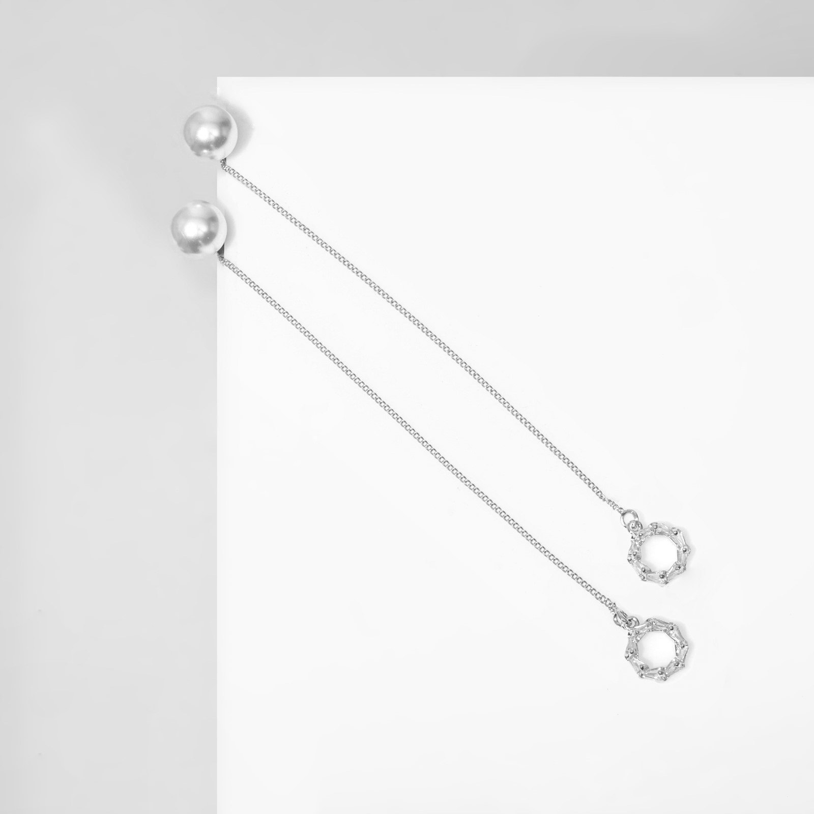 Серьги с жемчугом "Цепочки" кольцо и бусина, цвет белый в серебре, шар №10, 1x12.5x1 см., QF, Китай