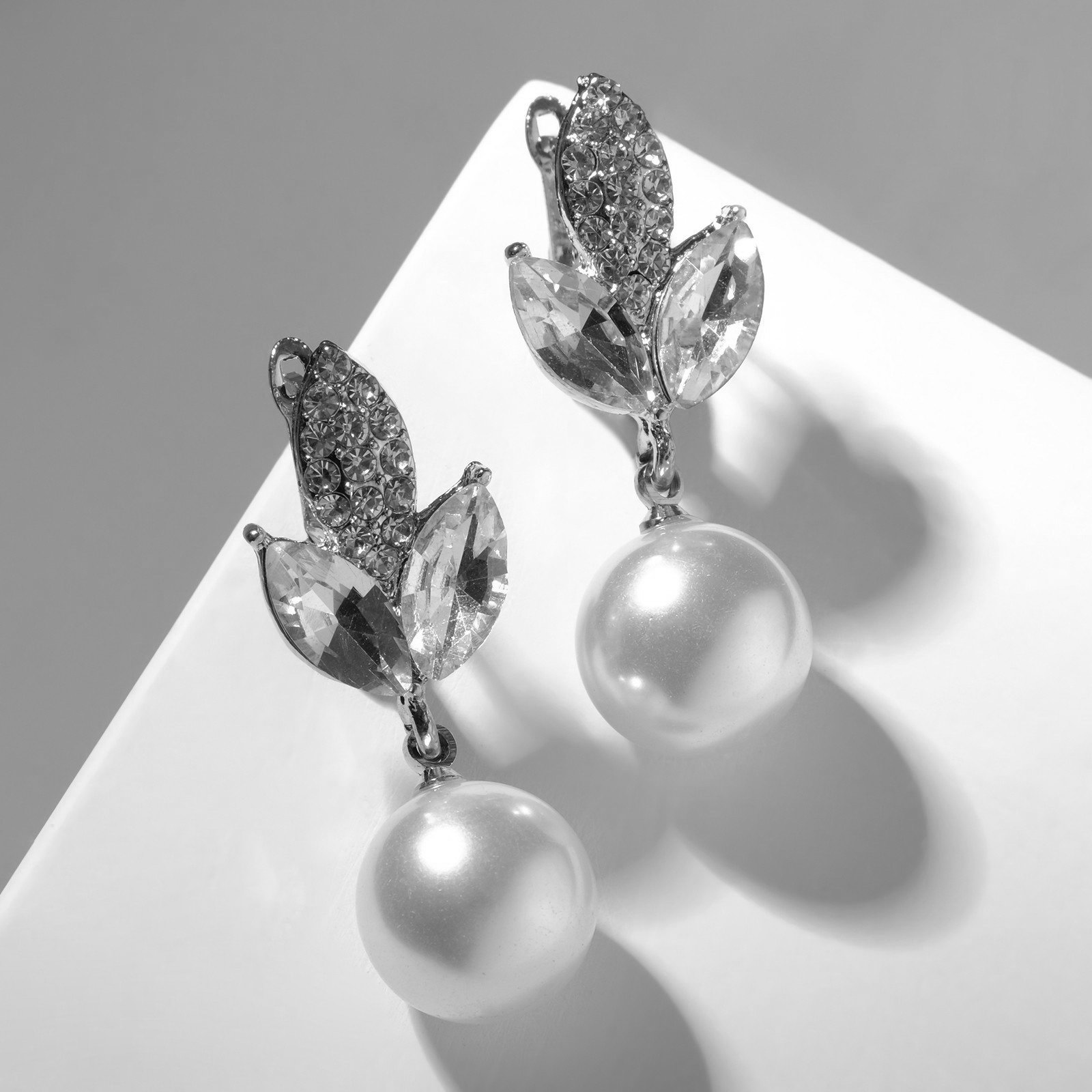 Серьги с жемчугом "Грейс" листья, цвет белый в серебре, 1.3x3.5x1 см., QF, Китай