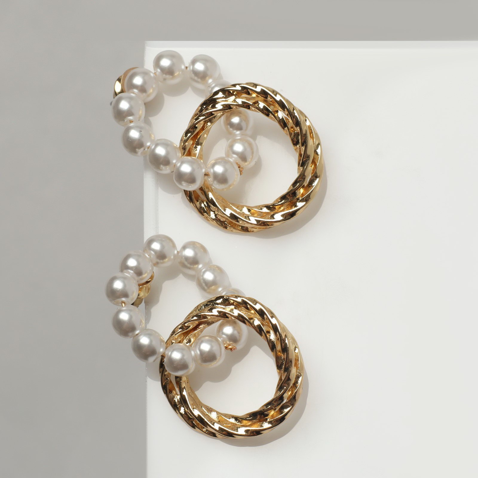 Серьги с жемчугом "Два кольца" бусины и металл, цвет золото, 2x4x0.5 см., QF, Китай