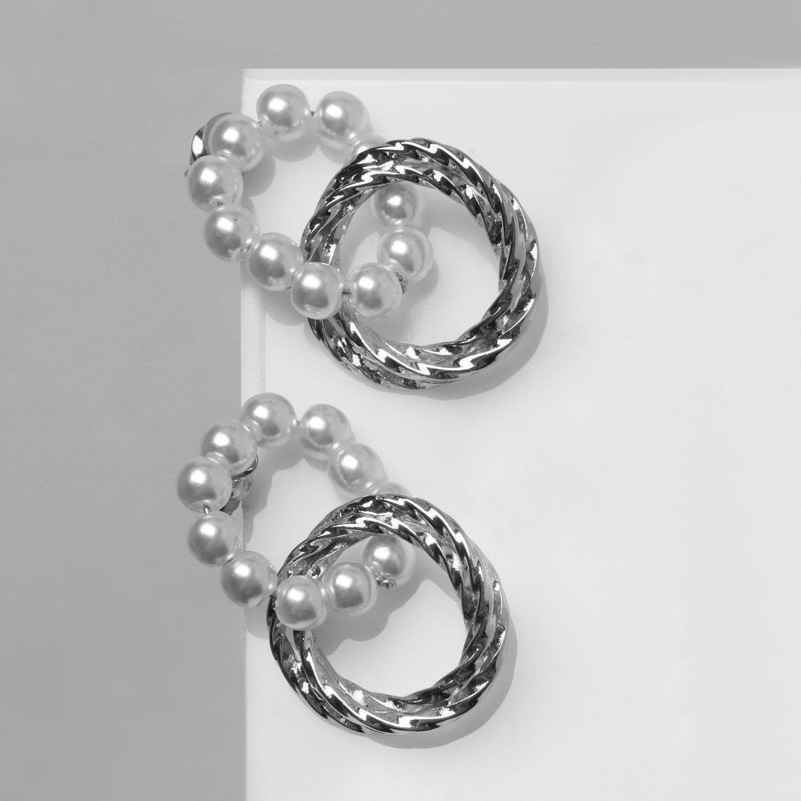 Серьги с жемчугом "Два кольца" бусины и металл, цвет серебро, 2x4x0.5 см., QF, Китай