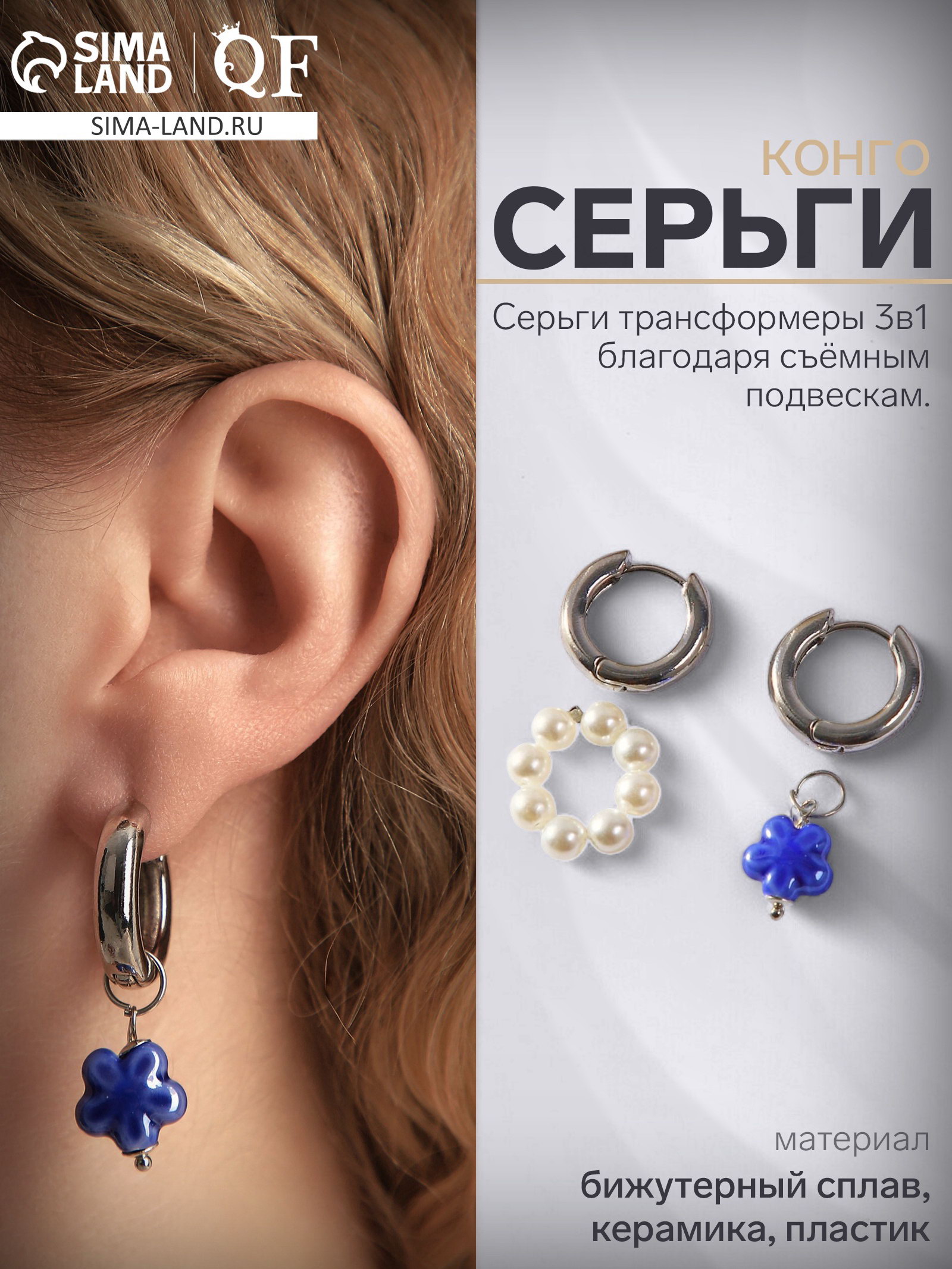 Серьги со съёмным элементом "Трансформер" цветок, цвет бело-синий в серебре, 2x4x2 см., QF, Китай