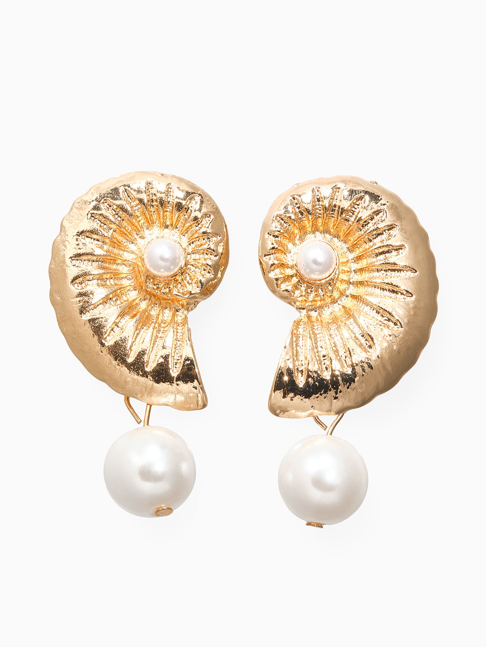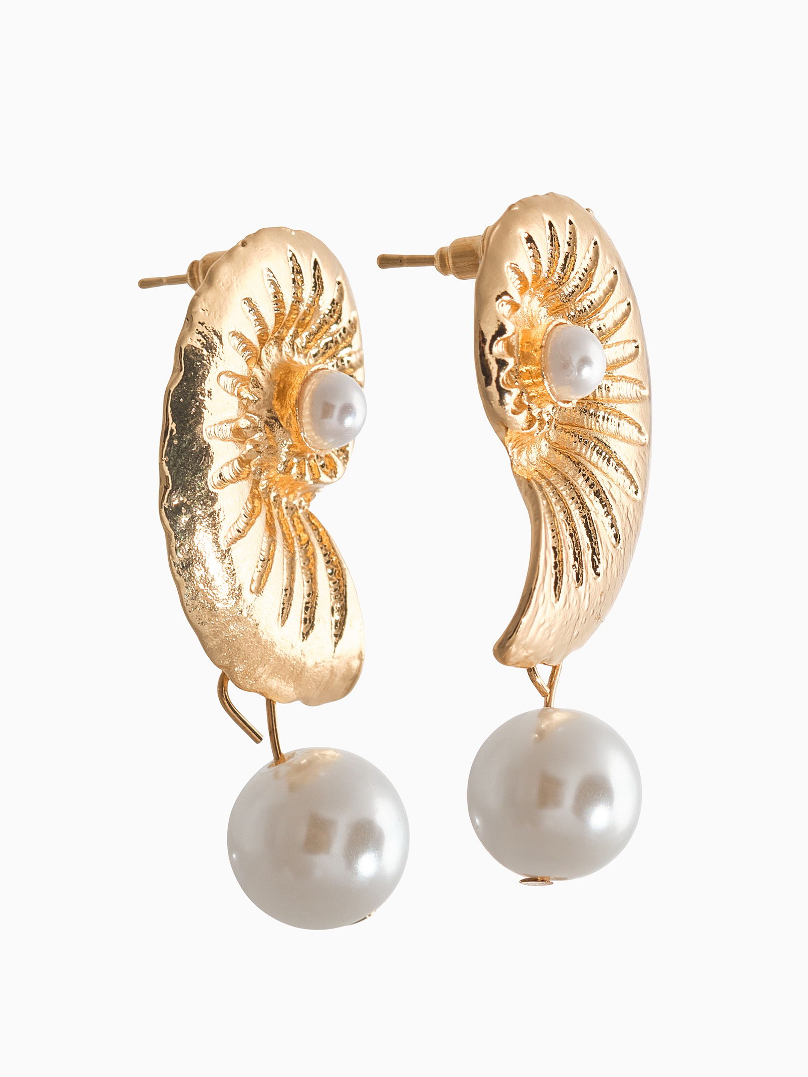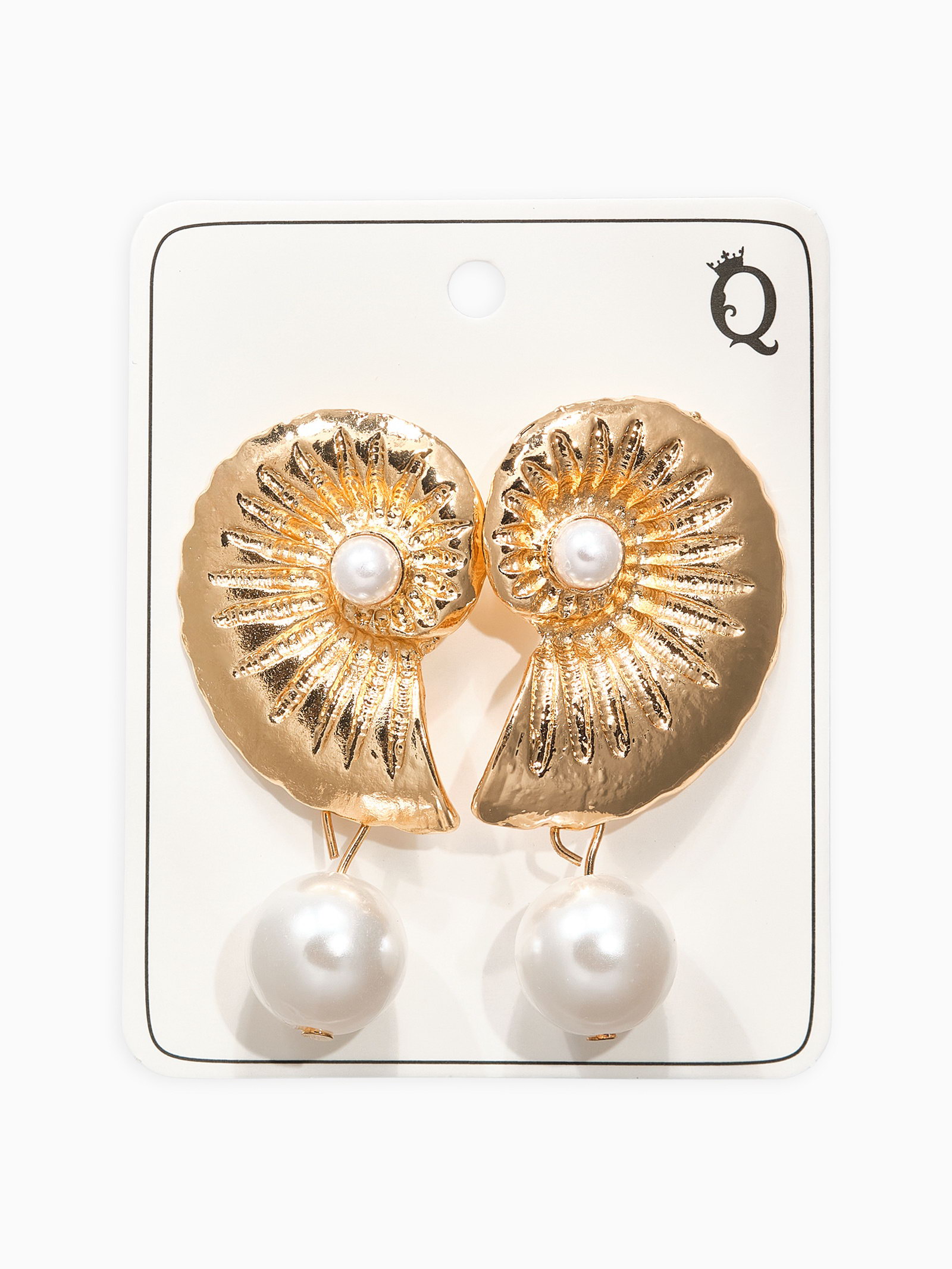 Серьги жемчуг "Ракушка", белые в золоте, 4x4x1.2 см., QF, Китай