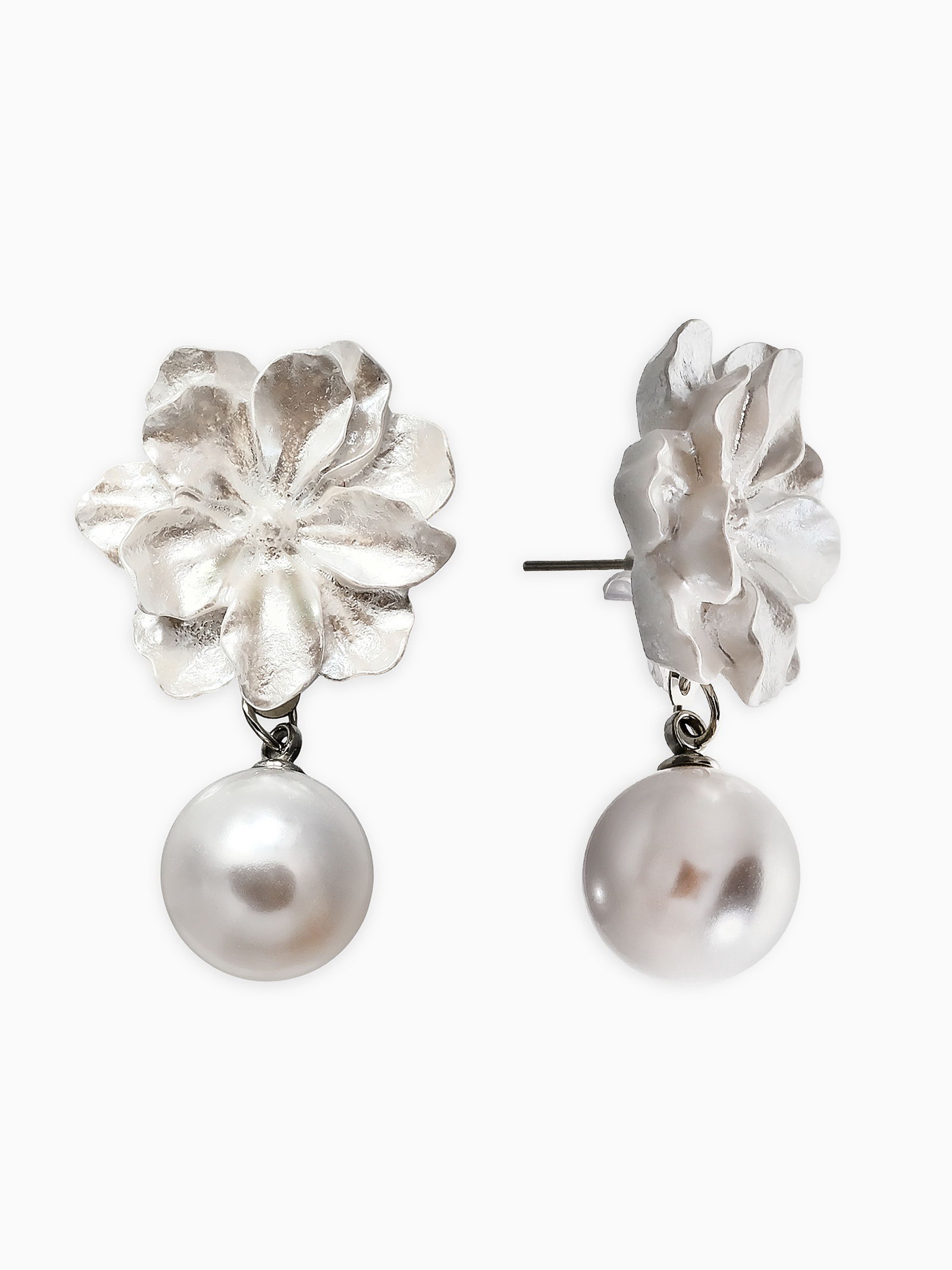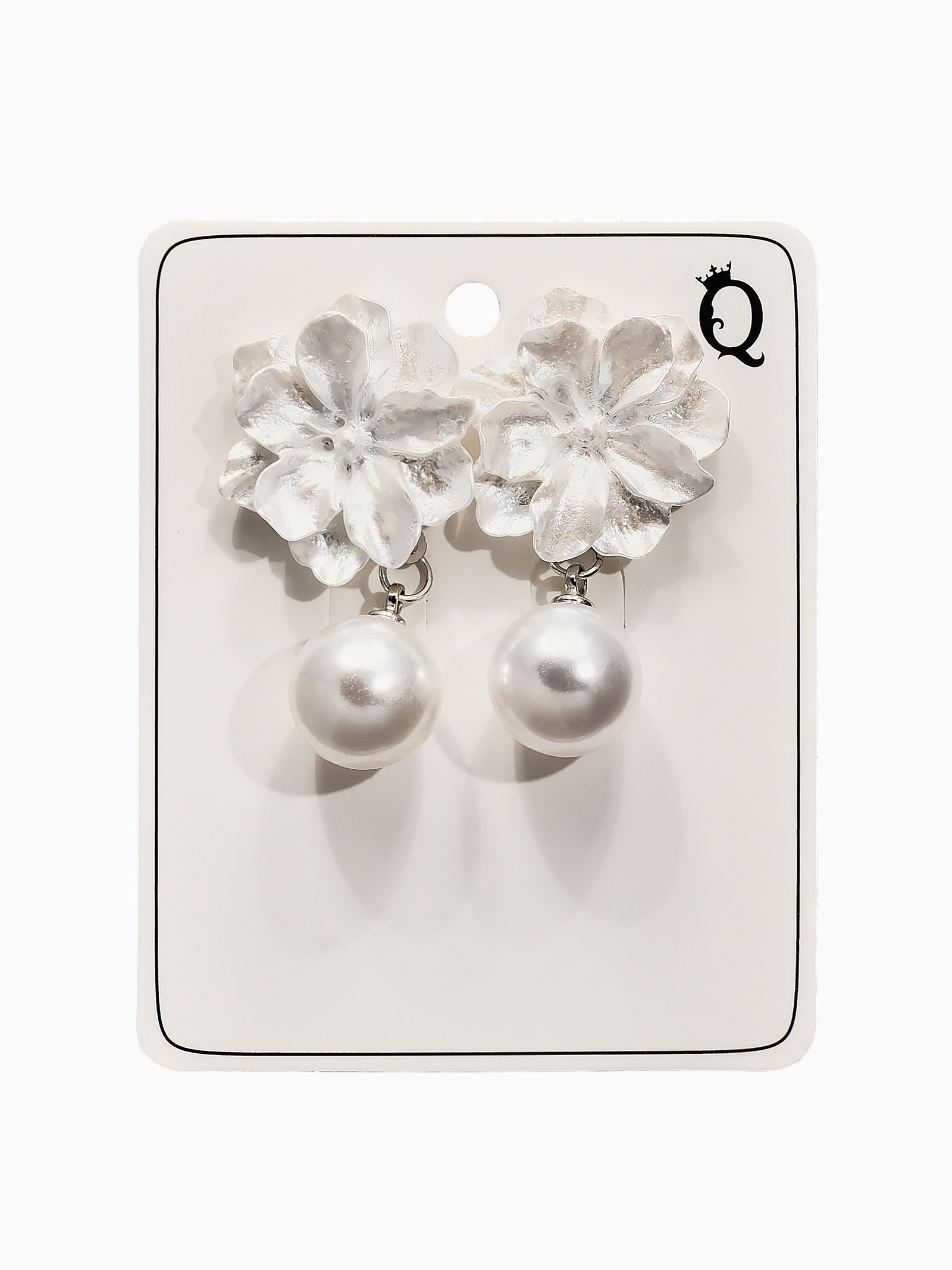 Серьги "Цветок с жемчугом", белые в серебре, 2.2x4x1.5 см., QF, Китай