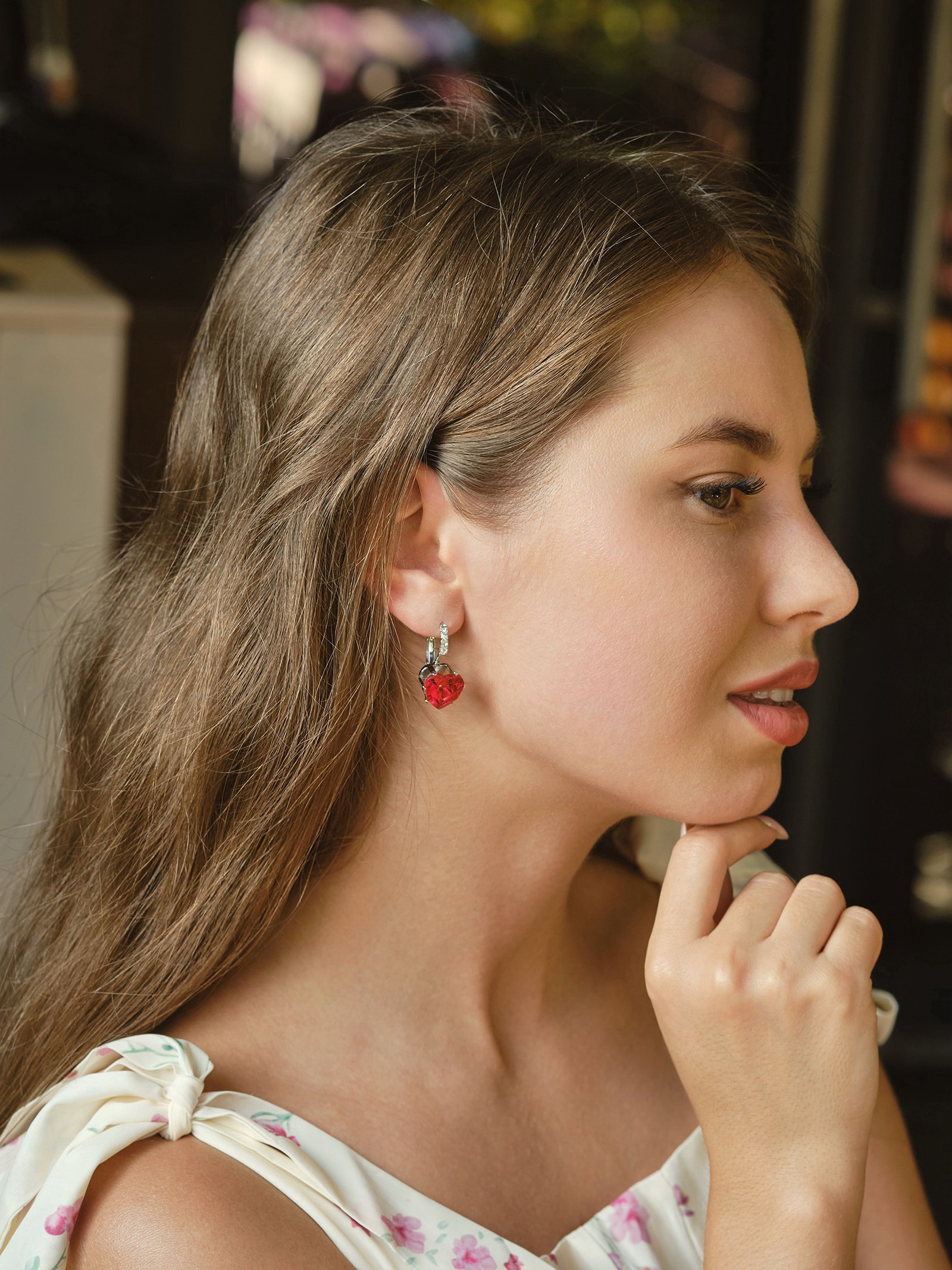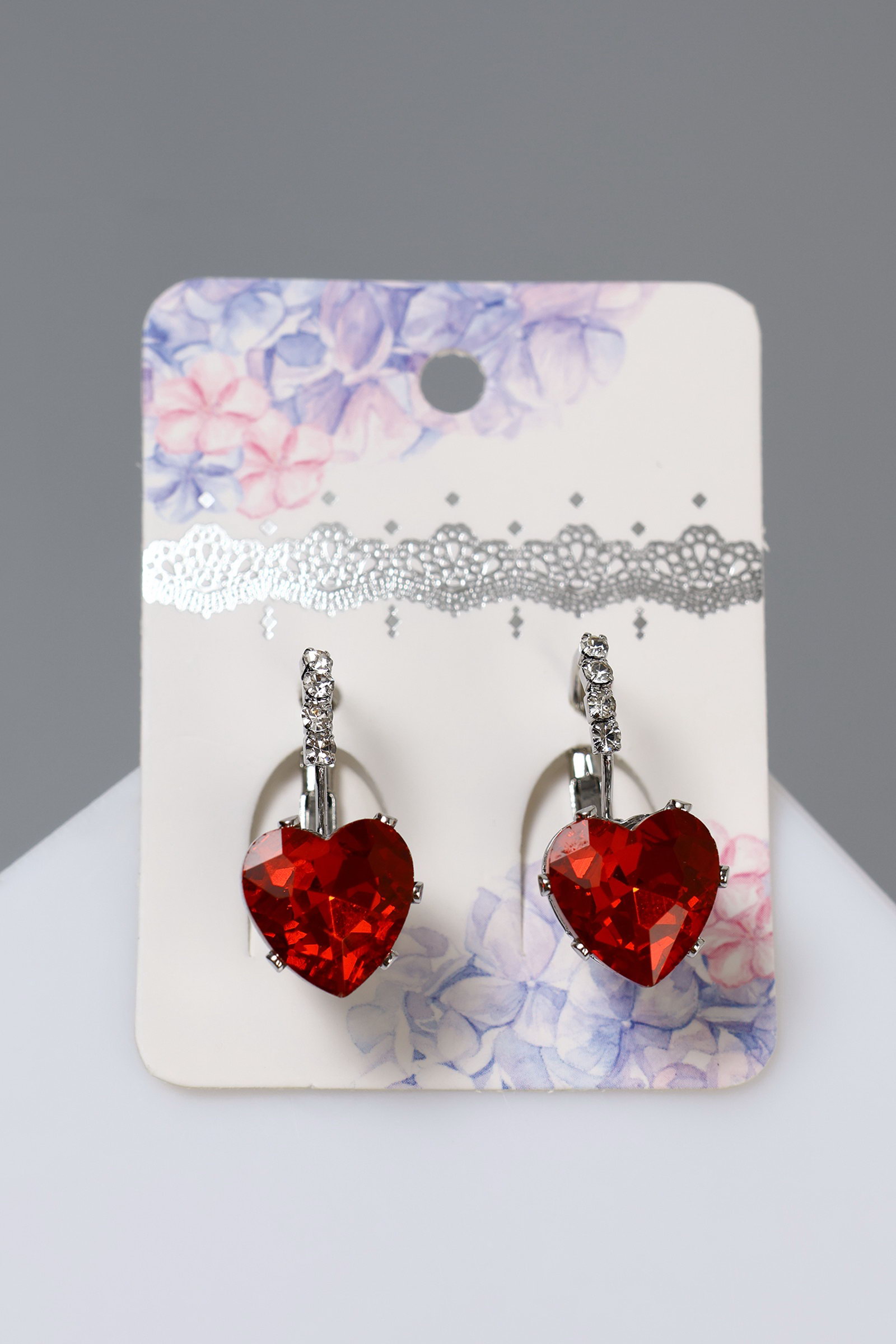 Серьги со стразами "Сердце" мерцание, бело-красные в серебре, 1.7x2.7x1 см., QF, Китай