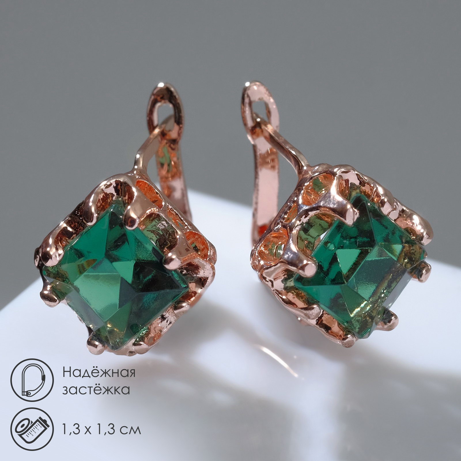 Серьги со стразами "Эдель" ромб, цвет зелёный в розовом золоте, 1.3x1.3x1 см., QF, Китай
