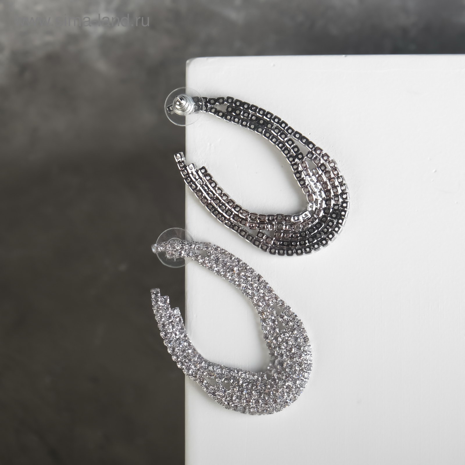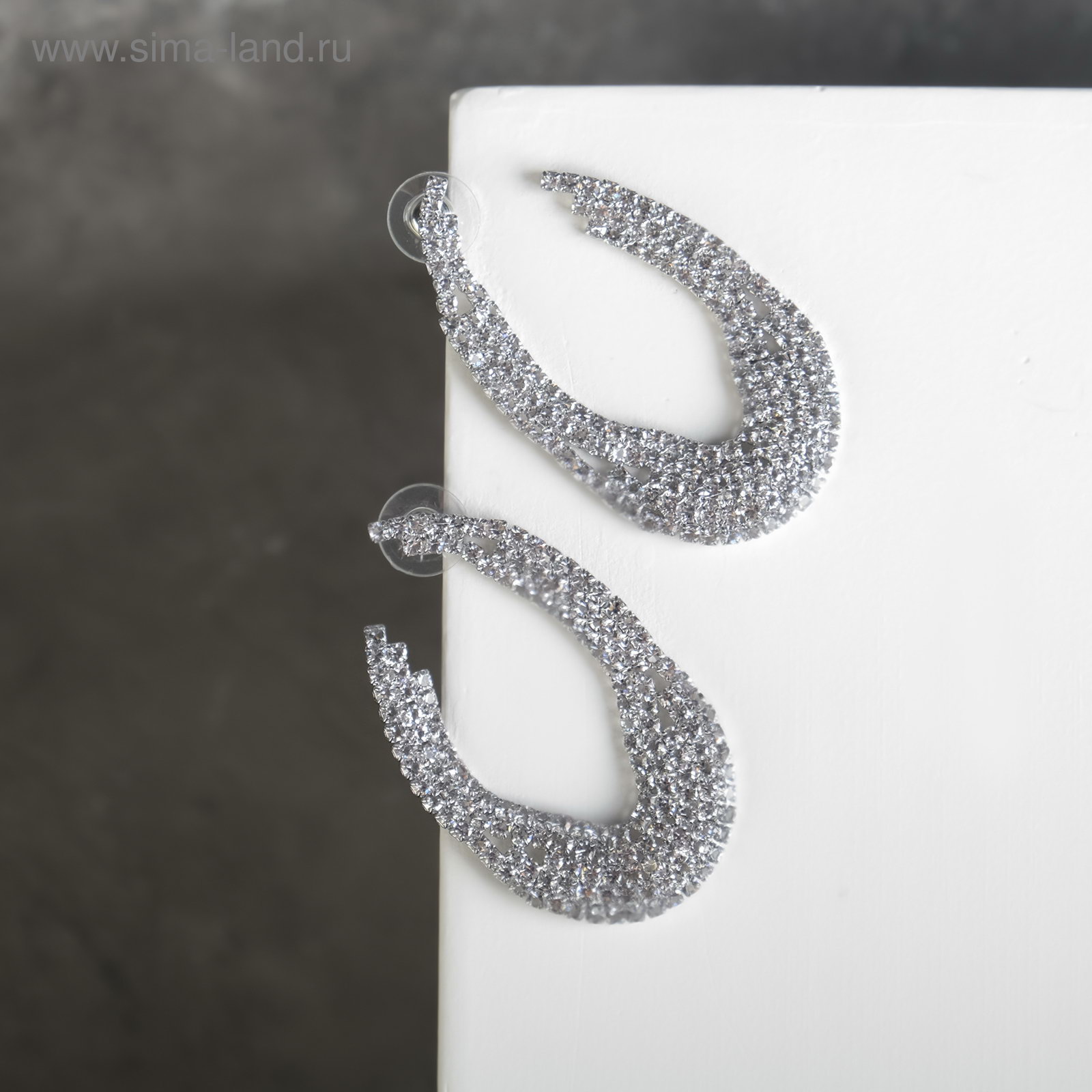 Серьги со стразами "Голливуд" дуга, цвет белый в серебре, 3x5.3x1 см., Китай