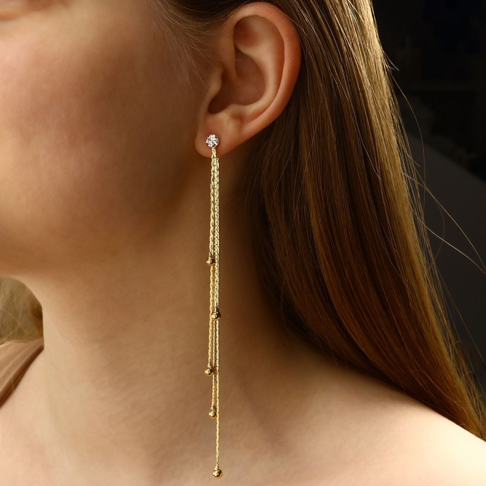 Серьги висячие со стразами "Селебрити" нити с бусинами, цвет белый в золоте, 12.5 см, 0.5x12.5x0.7 см., QF, Китай