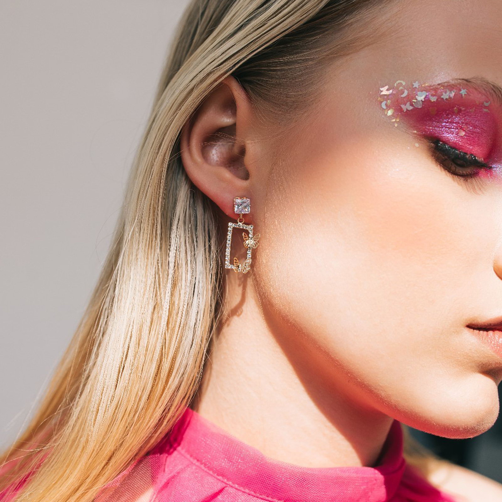 Серьги со стразами "Порхай" бабочки в прямоугольнике, белые в золоте, 1.2x3x0.7 см., QF, Китай