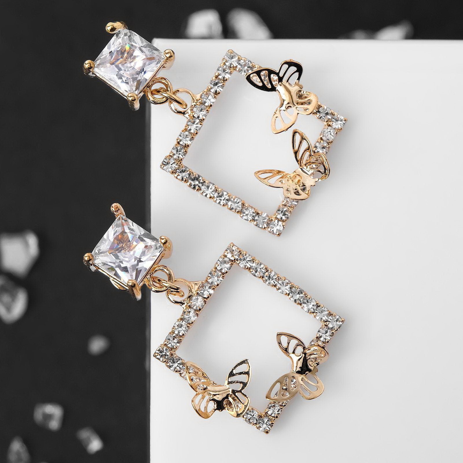 Серьги со стразами "Порхай" бабочки в квадрате, цвет белый в золоте, 1.2x2.5x0.7 см., QF, Китай
