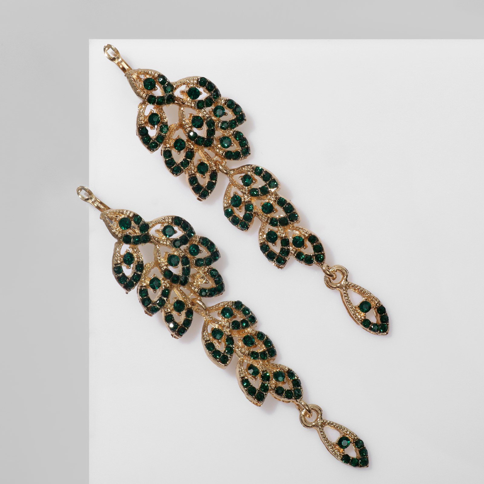 Серьги висячие со стразами "Вечерние" сплетение, цвет изумрудный в золоте, 8 см, 2x8x1 см., QF, Китай