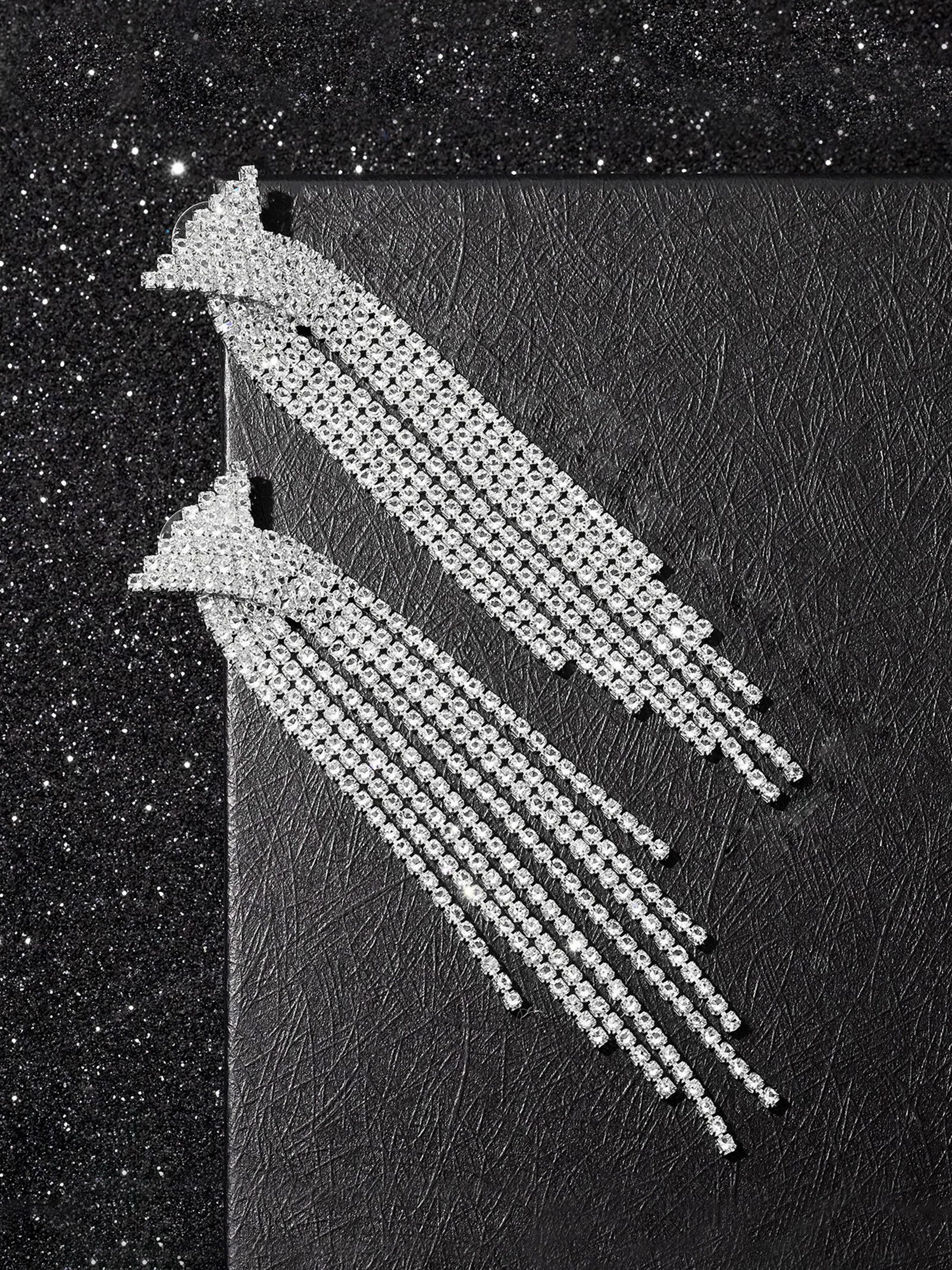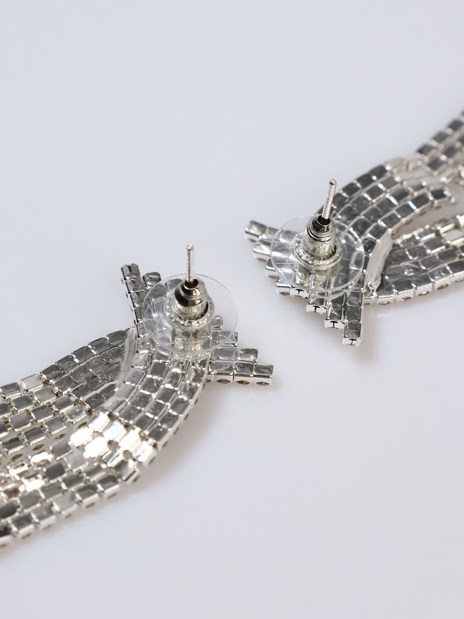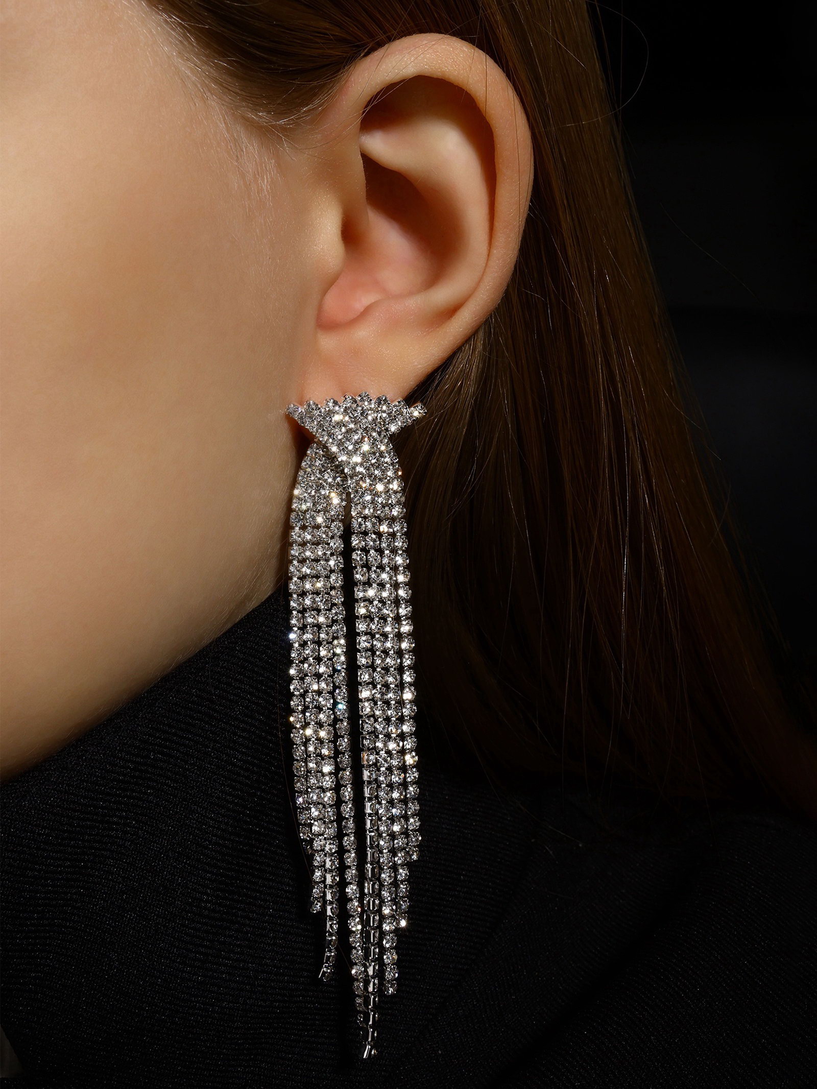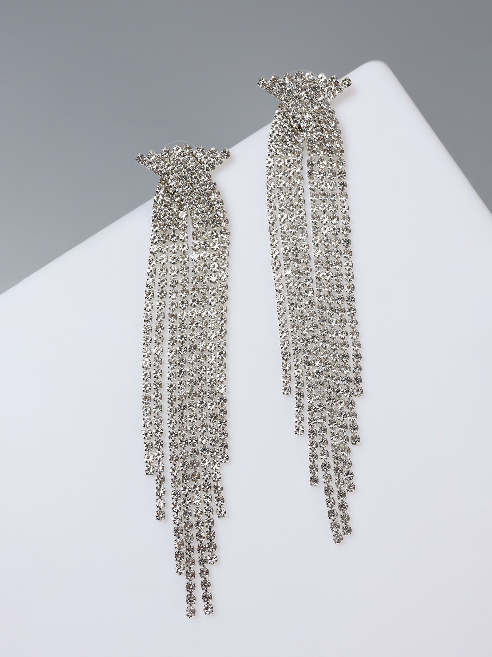 Серьги висячие со стразами "Водопад", бантик, белые в серебре,10 см, 2x10x1 см., QF, Китай