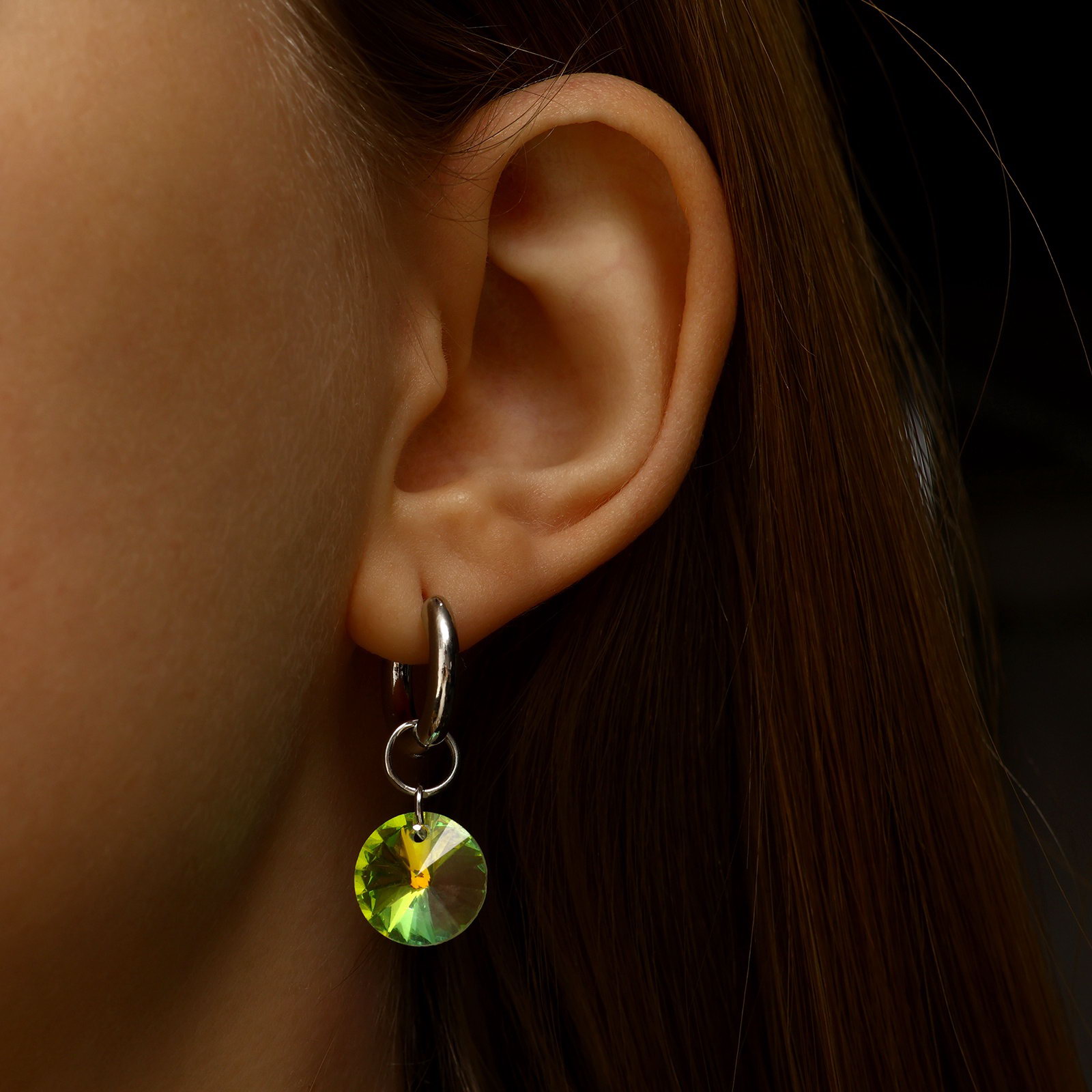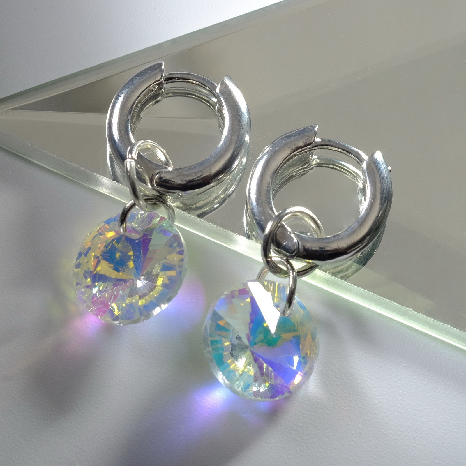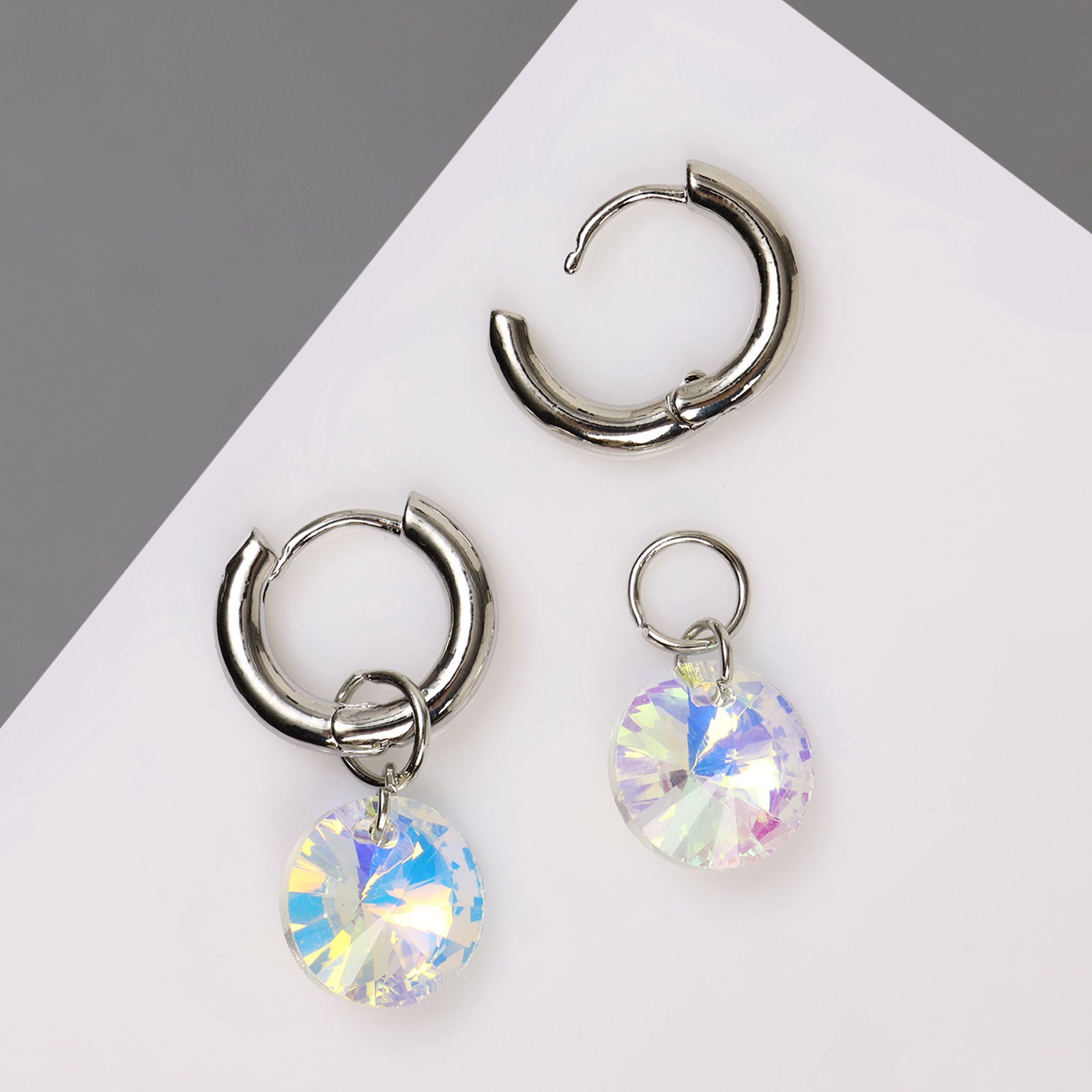 Серьги со съёмным элементом "Трансформер" круглый кристаллик, радужные в серебре, 1.2x3x1.5 см., QF, Китай