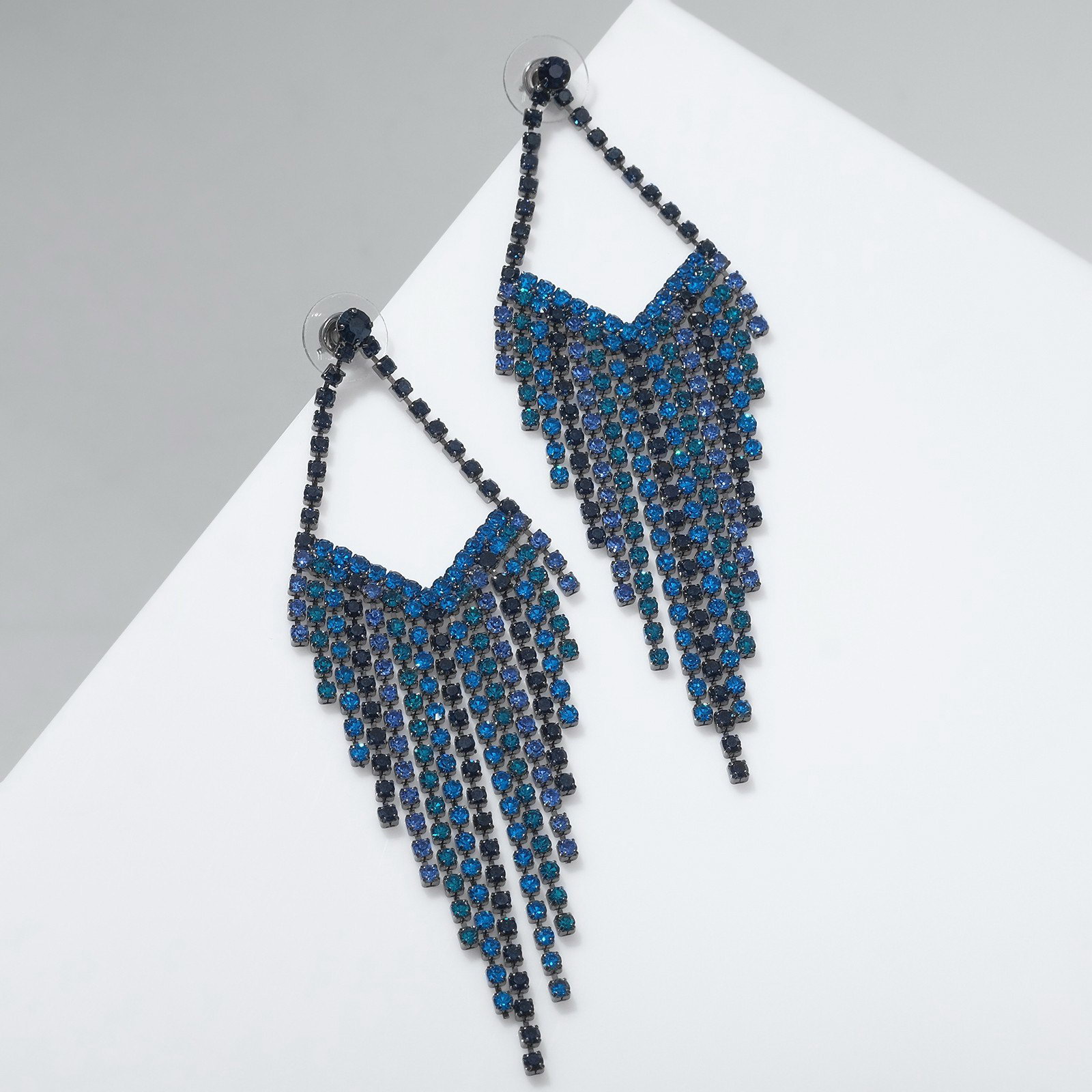 Серьги висячие со стразами "Водопад" каскад, сине-морских в сером металле, 9 см, 3.2x9x0.7 см., QF, Китай