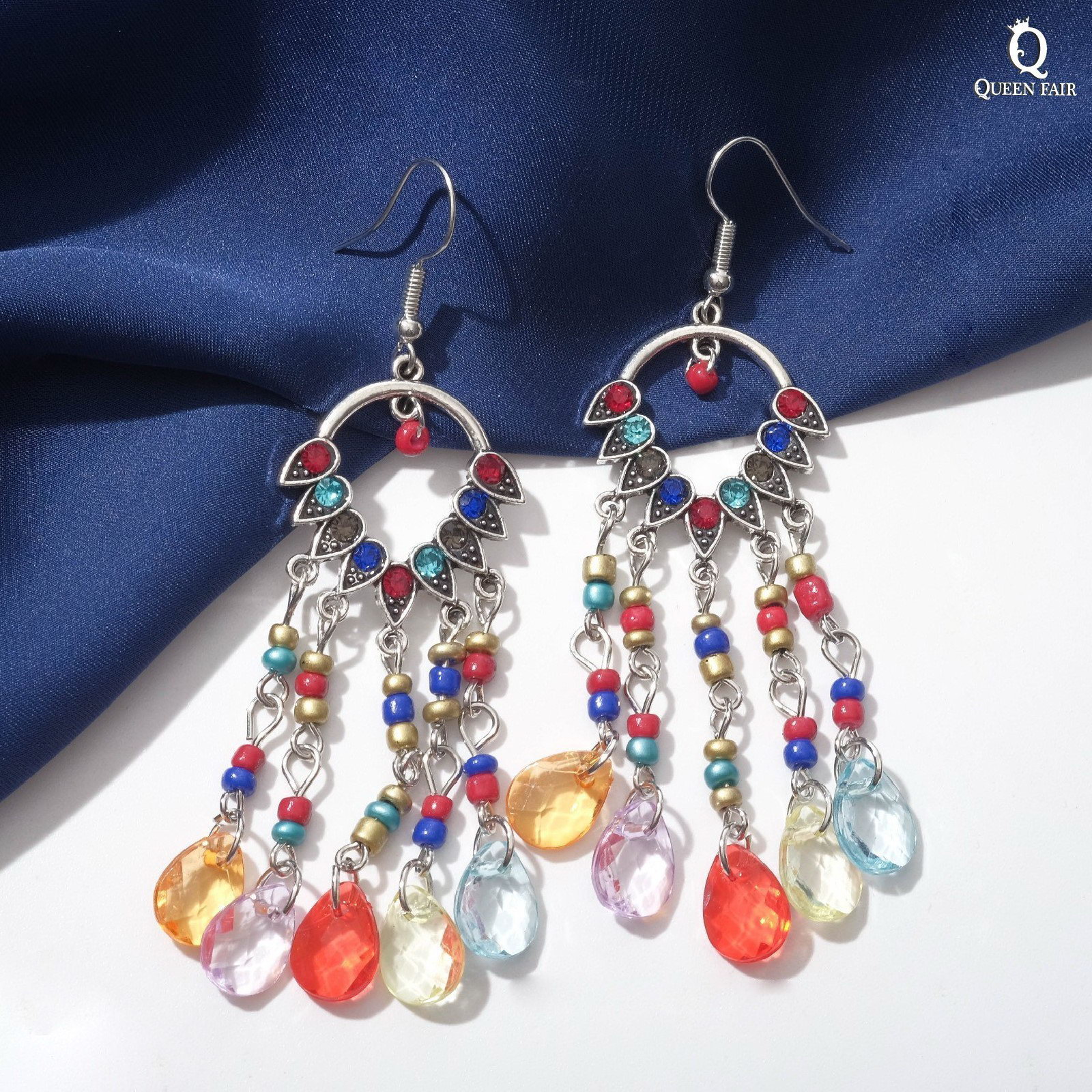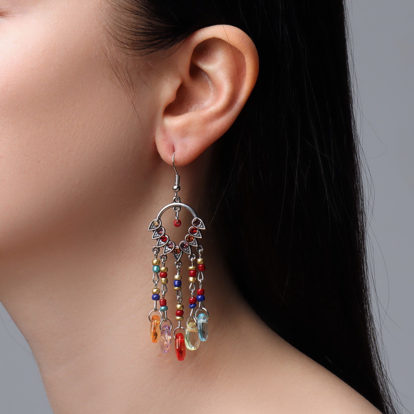 Серьги висячие со стразами "Восток" ловец снов, цветные в чернёном серебре, 8 см, 2.5x8x1.9 см., QF, Китай