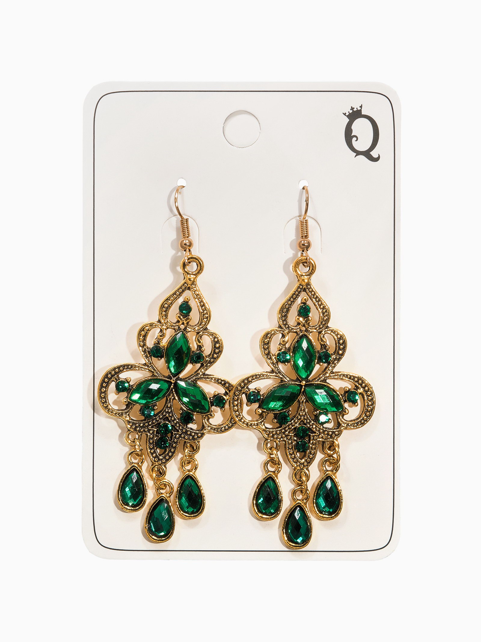 Серьги висячие со стразами "Восток" трилистник, цвет зелёный в чернёном золоте, 8 см, 3.2x8x1.9 см., QF, Китай