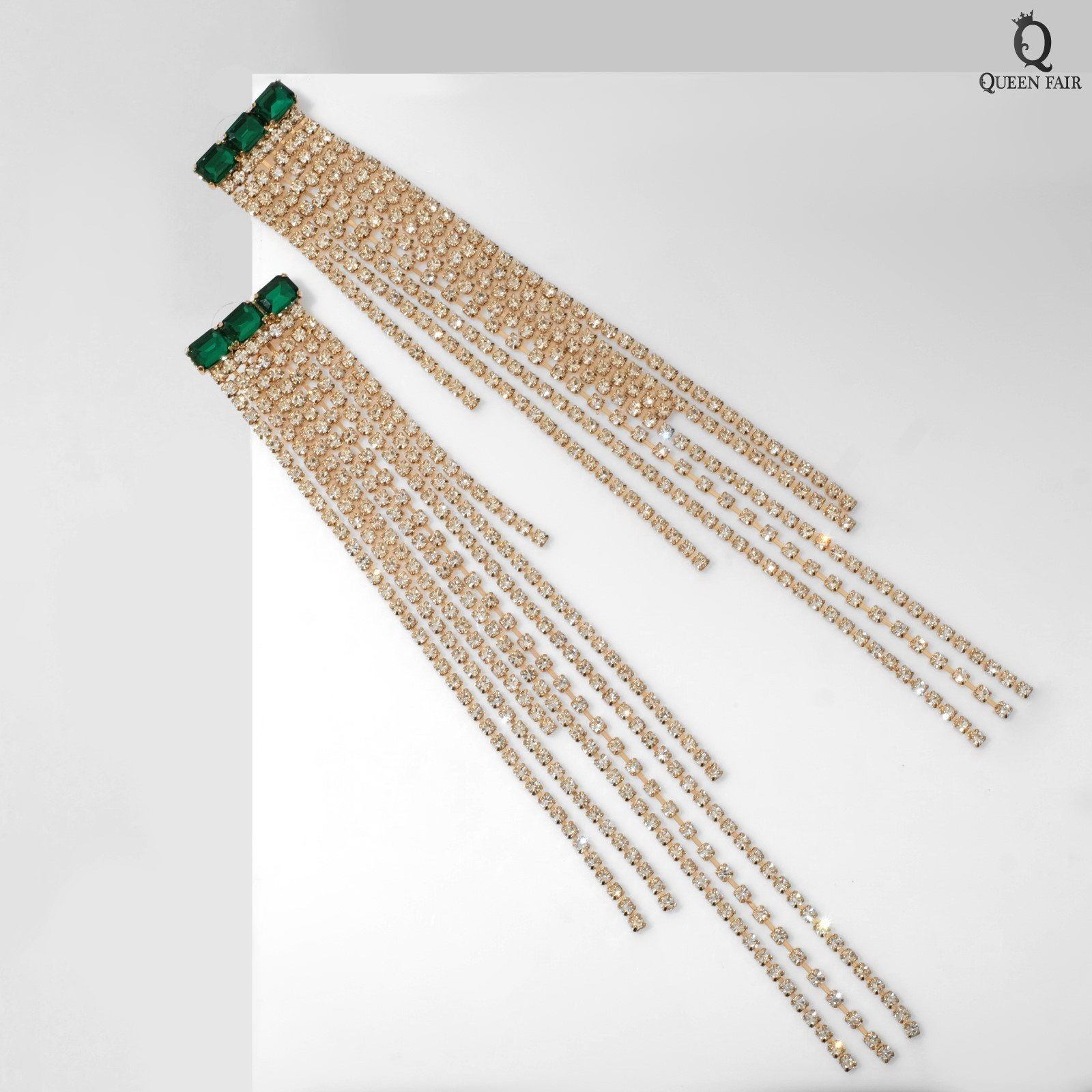 Серьги висячие со стразами "Мулен Руж" водопад, цвет бело-зелёный в золоте, 19 см, 2.2x19x0.5 см., QF, Китай