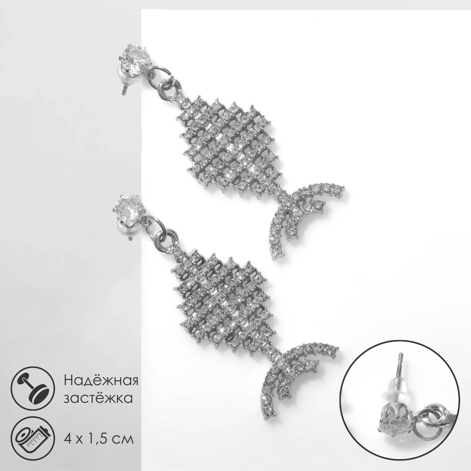 Серьги со стразами "Рыбки" миниатюрные, цвет белый в серебре, 1.5x4x0.3 см., Queen fair, Китай
