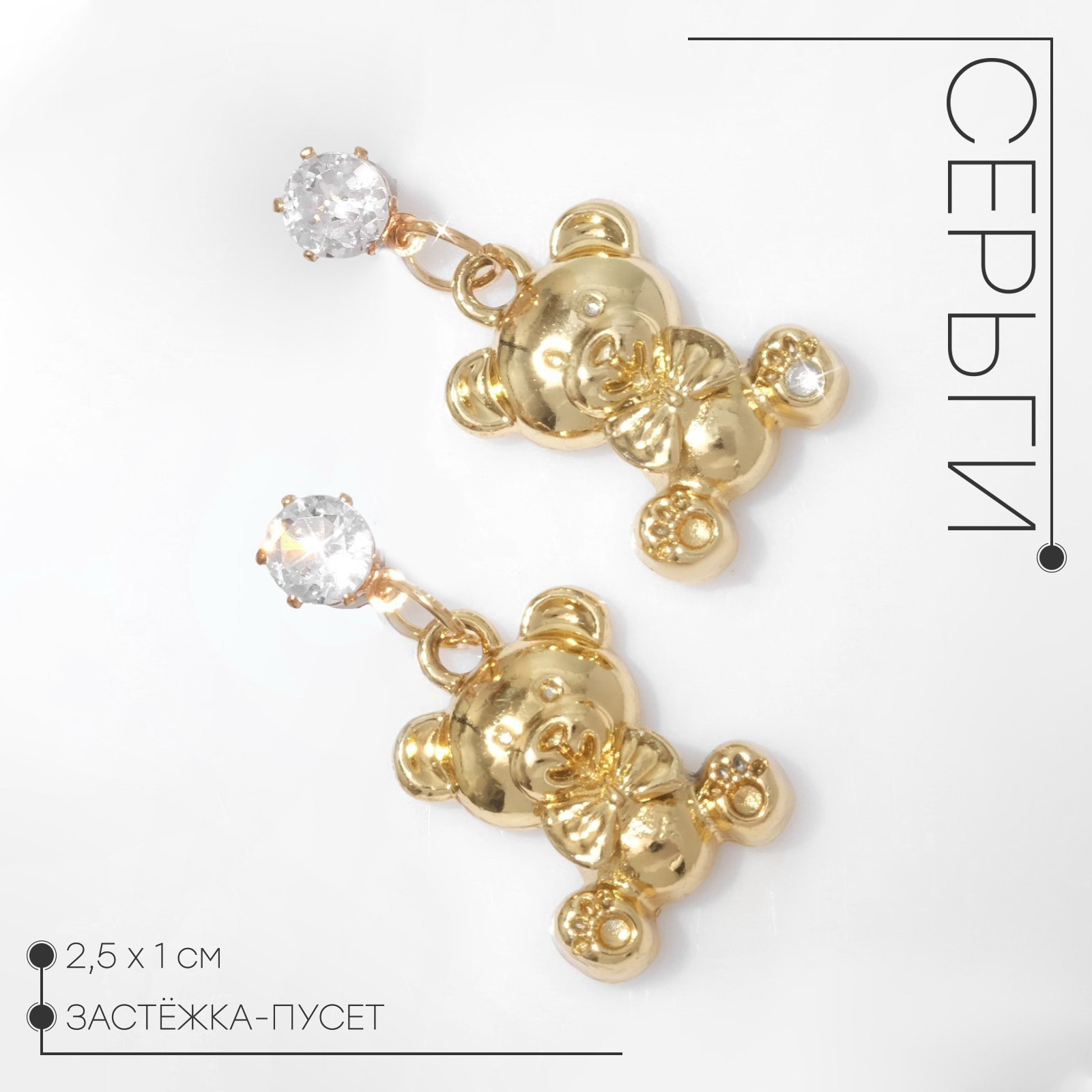 Серьги со стразами "Мишки" плюшевые с бантиками, цвет белый в золоте, 1x2.5x0.4 см., Queen fair, Китай