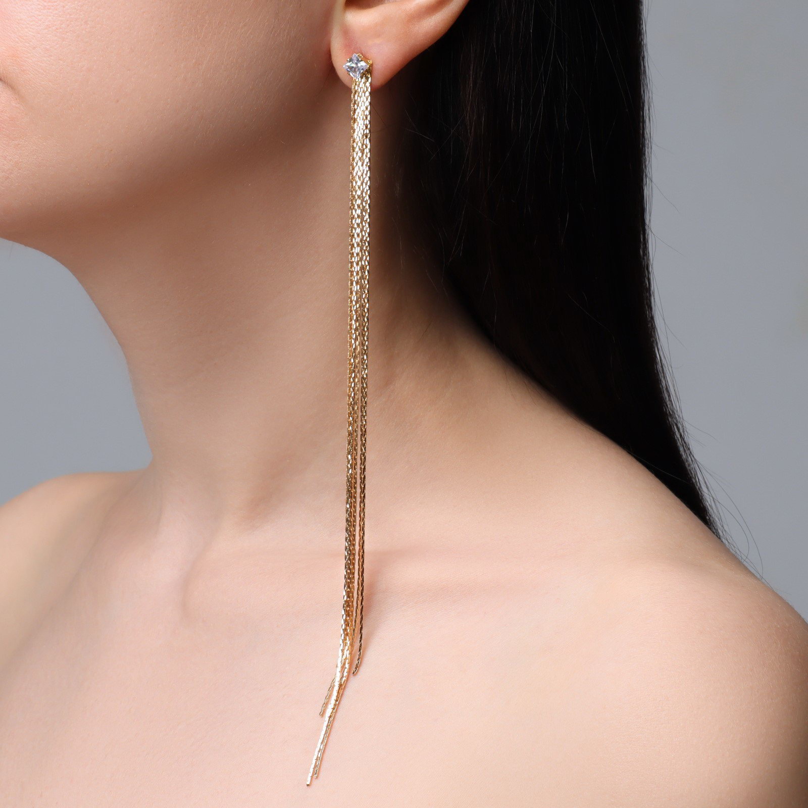 Серьги висячие со стразами "Голливуд" тонкость линий, цвет белый в золоте, 19.5 см, 0.5x19.5x0.5 см., QF, Китай