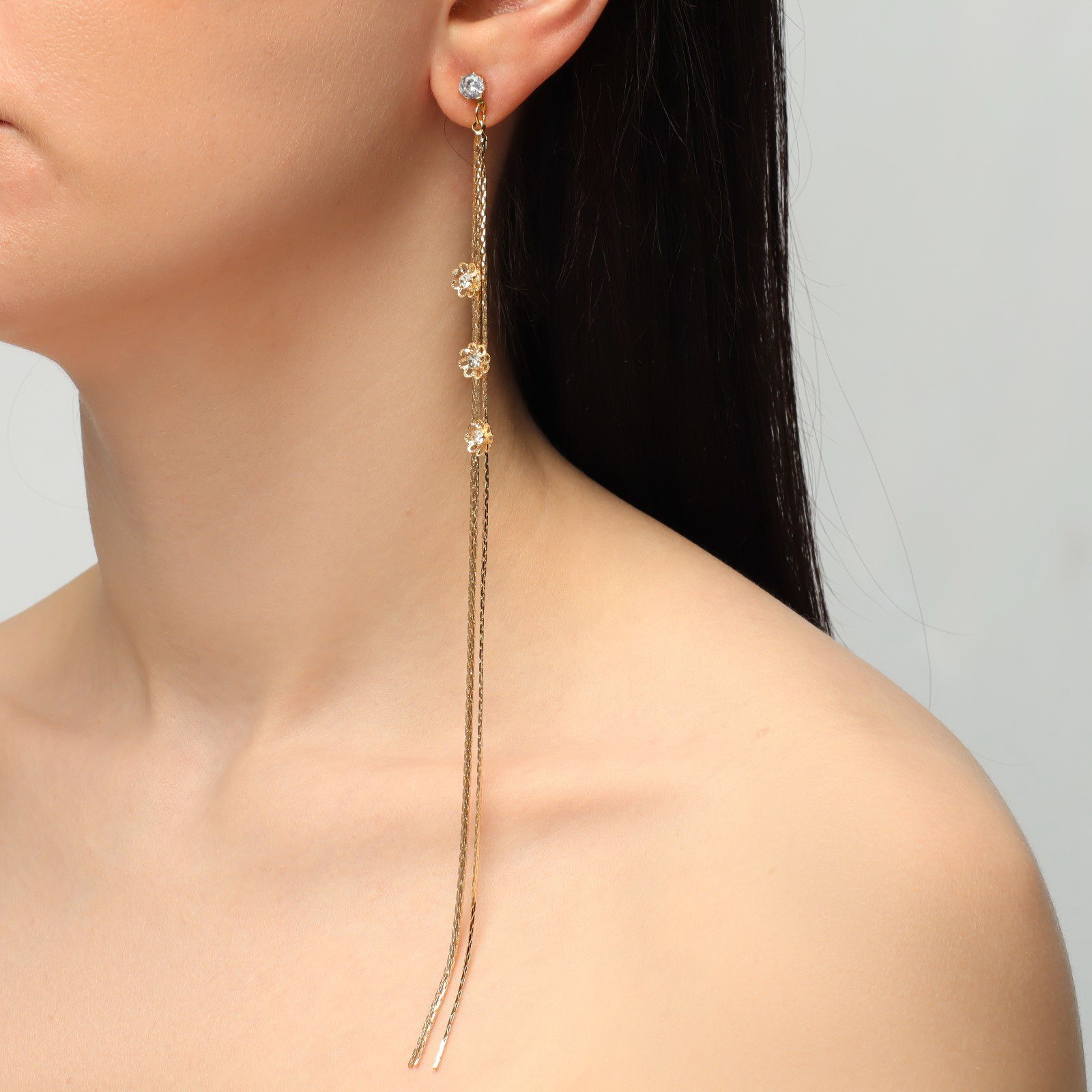 Серьги висячие со стразами "Голливуд" цветы на нитях, цвет белый в золоте, 19.5 см, 0.5x19.5x0.5 см., QF, Китай