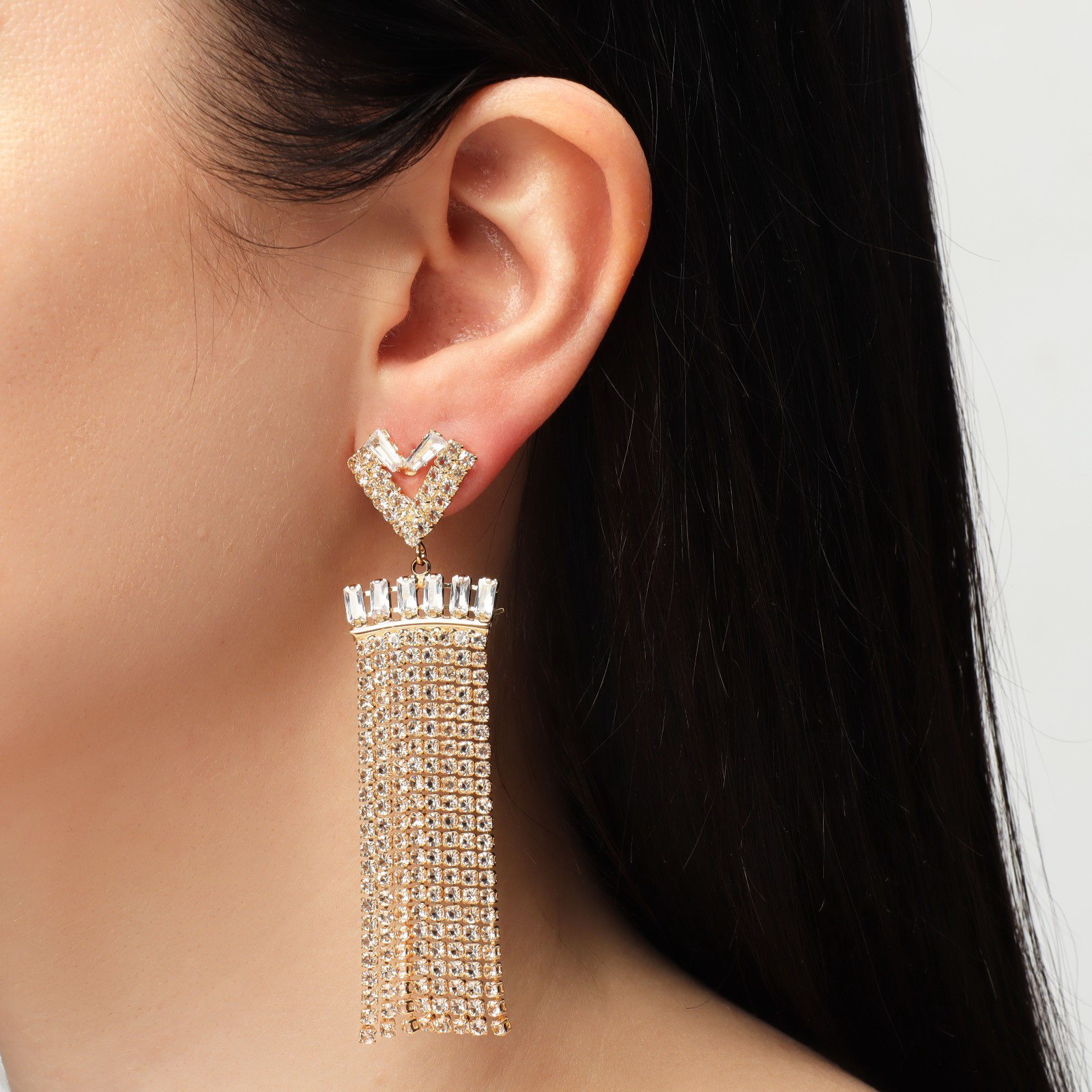 Серьги висячие со стразами "Грация" сердца, 8 рядов, цвет белый в золоте, 8 см, 2x8x0.3 см., QF, Китай