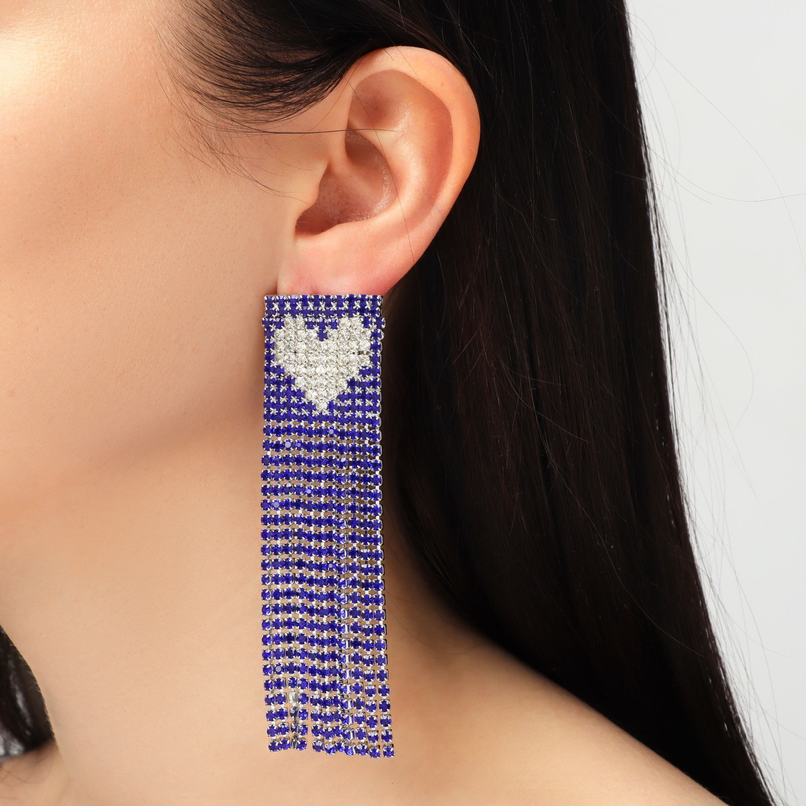 Серьги висячие со стразами "Грация" сердца в квадрате, цвет бело-синий в серебре, 9.5 см, 2.5x9.5x0.3 см., QF, Китай