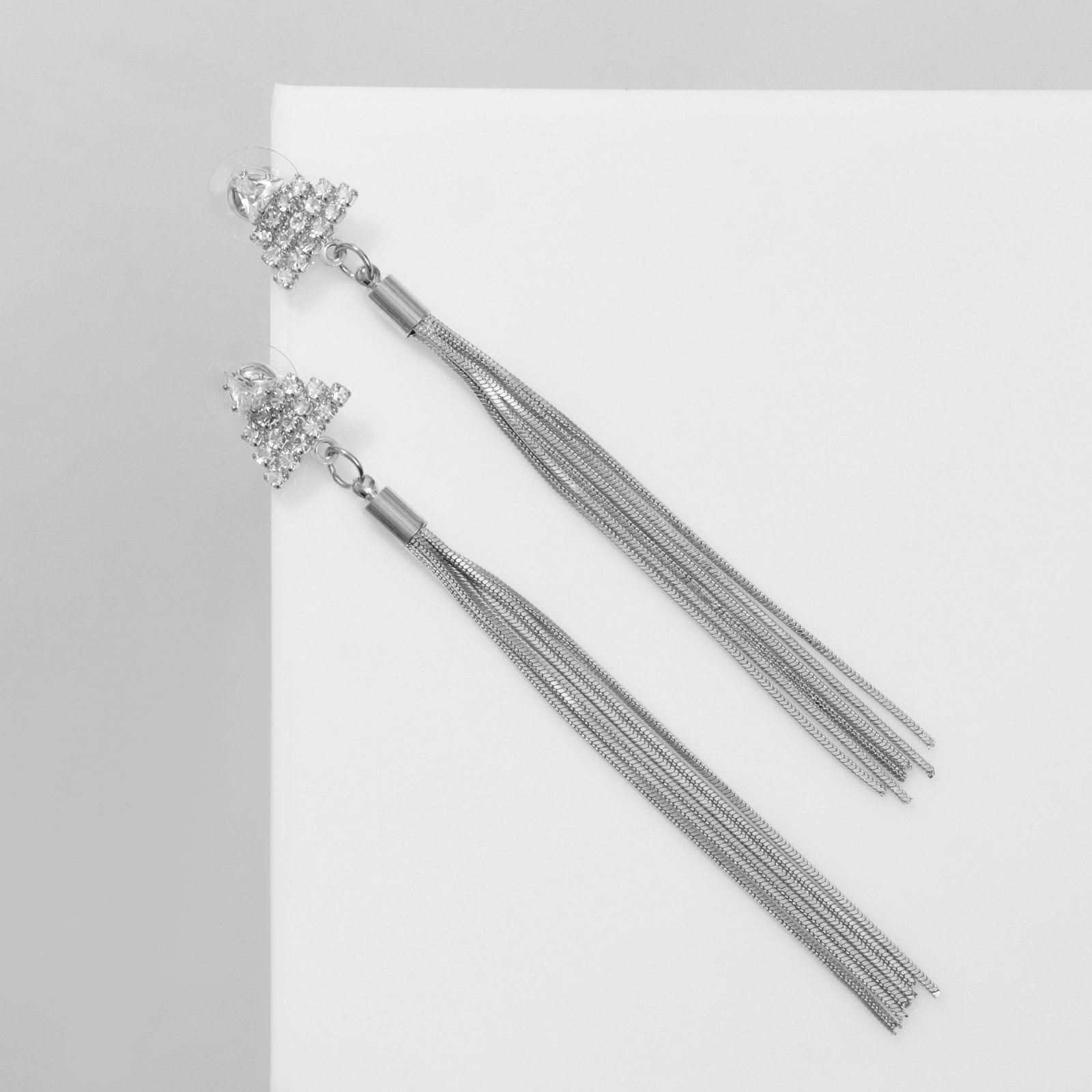 Серьги висячие со стразами "Одиссея" треугольник, цвет белый в серебре, 1.2x9x1 см., QF, Китай