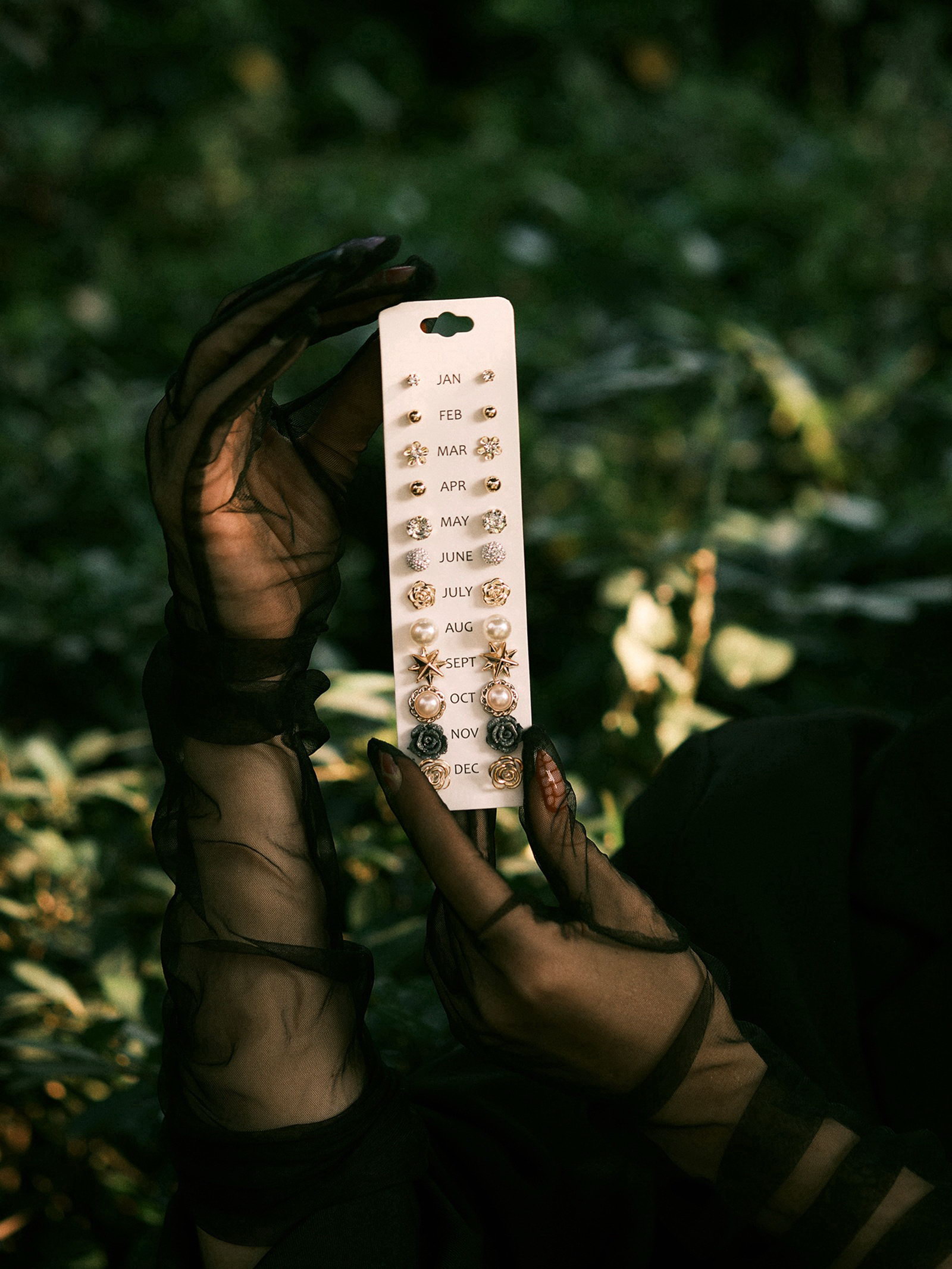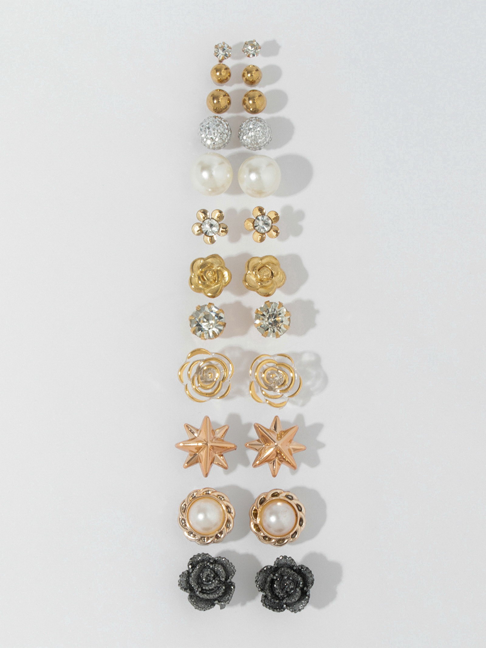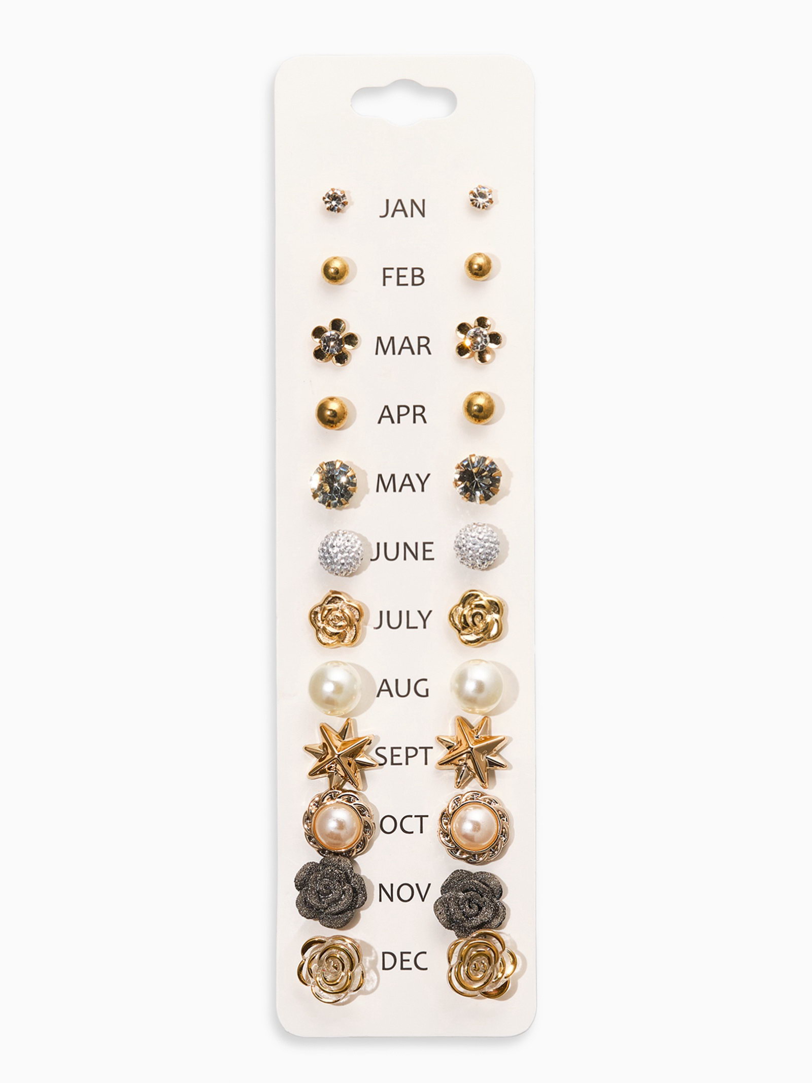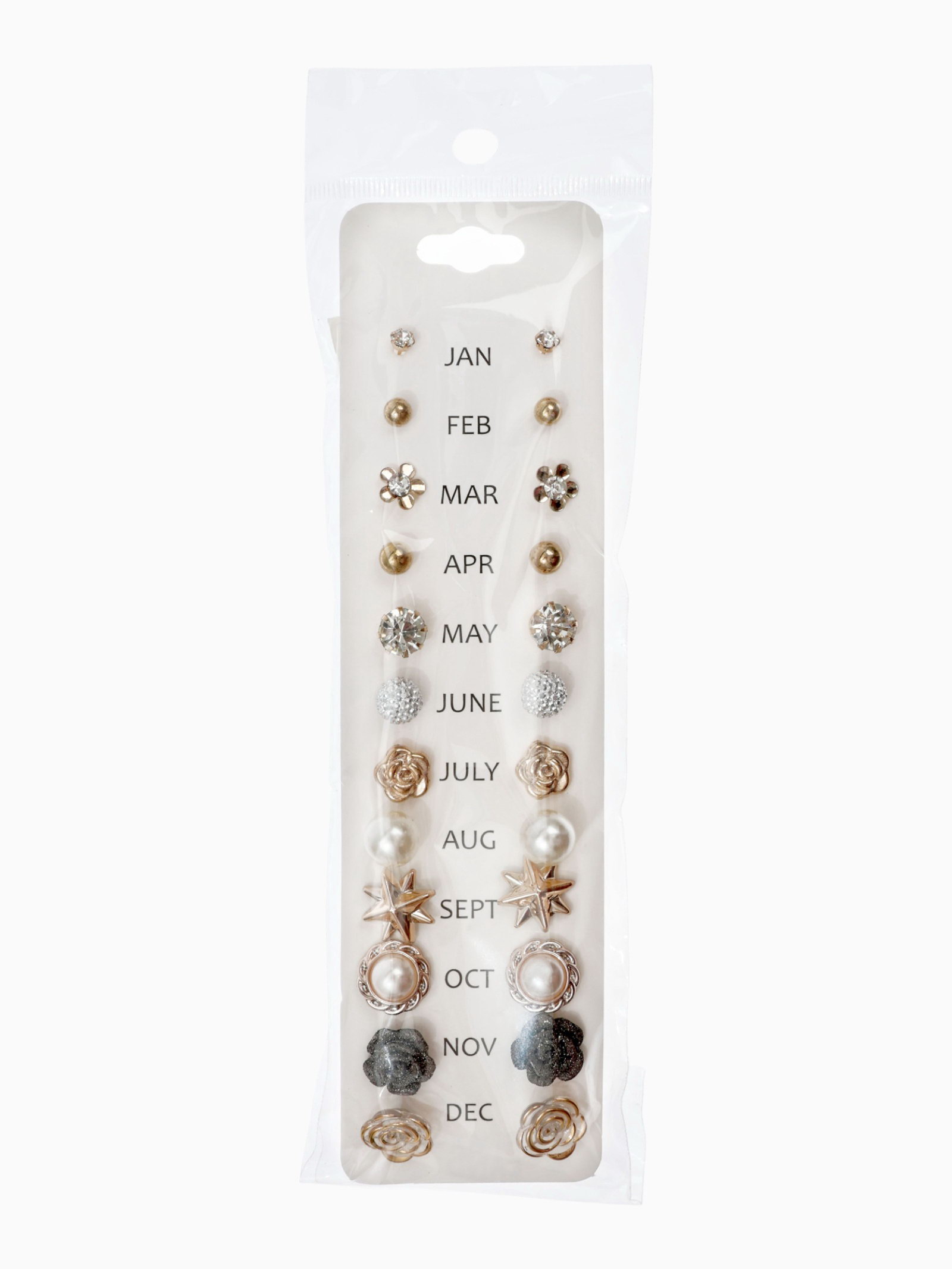 Серьги пусеты 12 пар One year, романтика, бело-серые в золоте, 1.1x1.1x1 см., QF, Китай