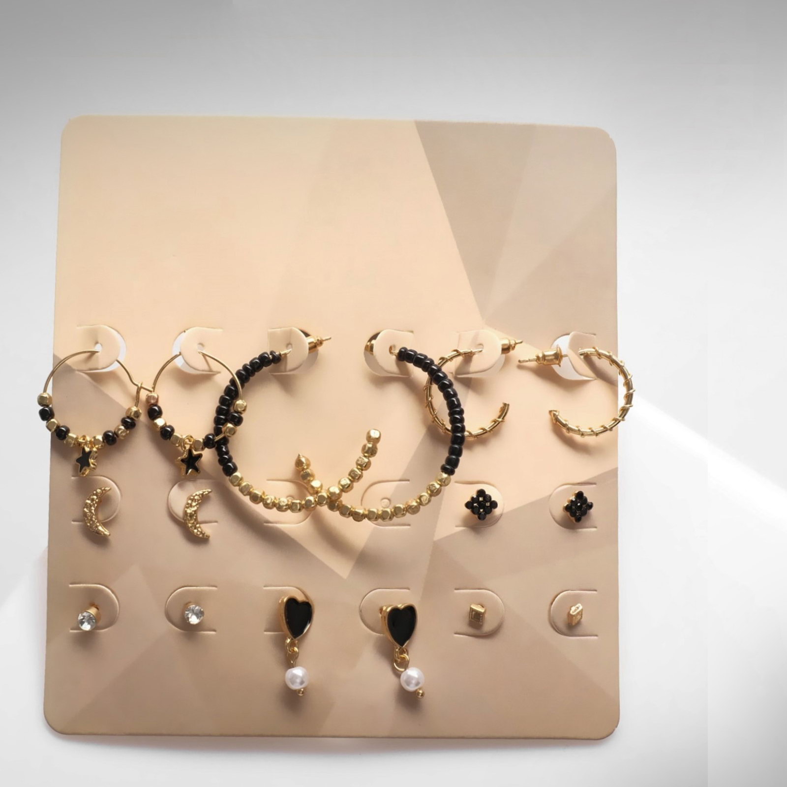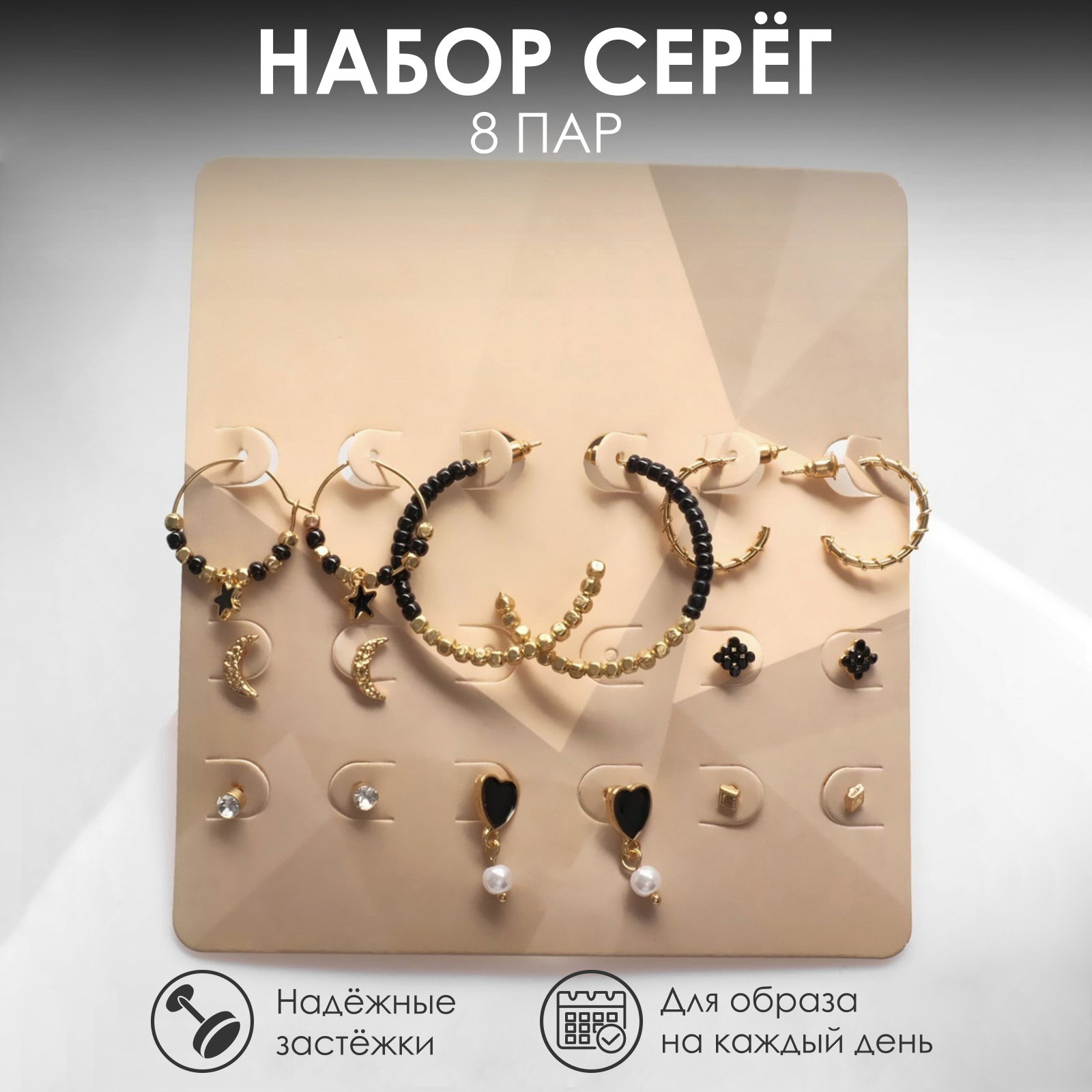 Вставка/Подвеска: Пластик, Стекло, Стразы, Эмаль Размер упаковки: 9 x 1 x 10 см. Вид застёжки: Застёжка пусет (гвоздик) Для кого: Для женщины Тематика: Космос Тематика: Космос tnved: 7117190000 Набор: Да Длина, см: 4 Цвет фурнитуры: Золотой Цвет: Чёрный Позвольте себе окунуться в мир элегантности и стиля с набором серёг, который не оставит равнодушной ни одну модницу. Этот набор из 8 пар серёг "Ночь" в чёрно-белом цвете с золотой фурнитурой идеальное дополнение к вашему образу, которое подчеркнёт вашу индивидуальность и добавит нотку загадки. Каждая пара серёг длиной 4 см выполнена из высококачественного металла и украшена стразами, эмалью и стеклом, что придаёт им особый блеск и шарм. Застёжка-пусет обеспечивает комфортную посадку, позволяя носить их весь день без дискомфорта.