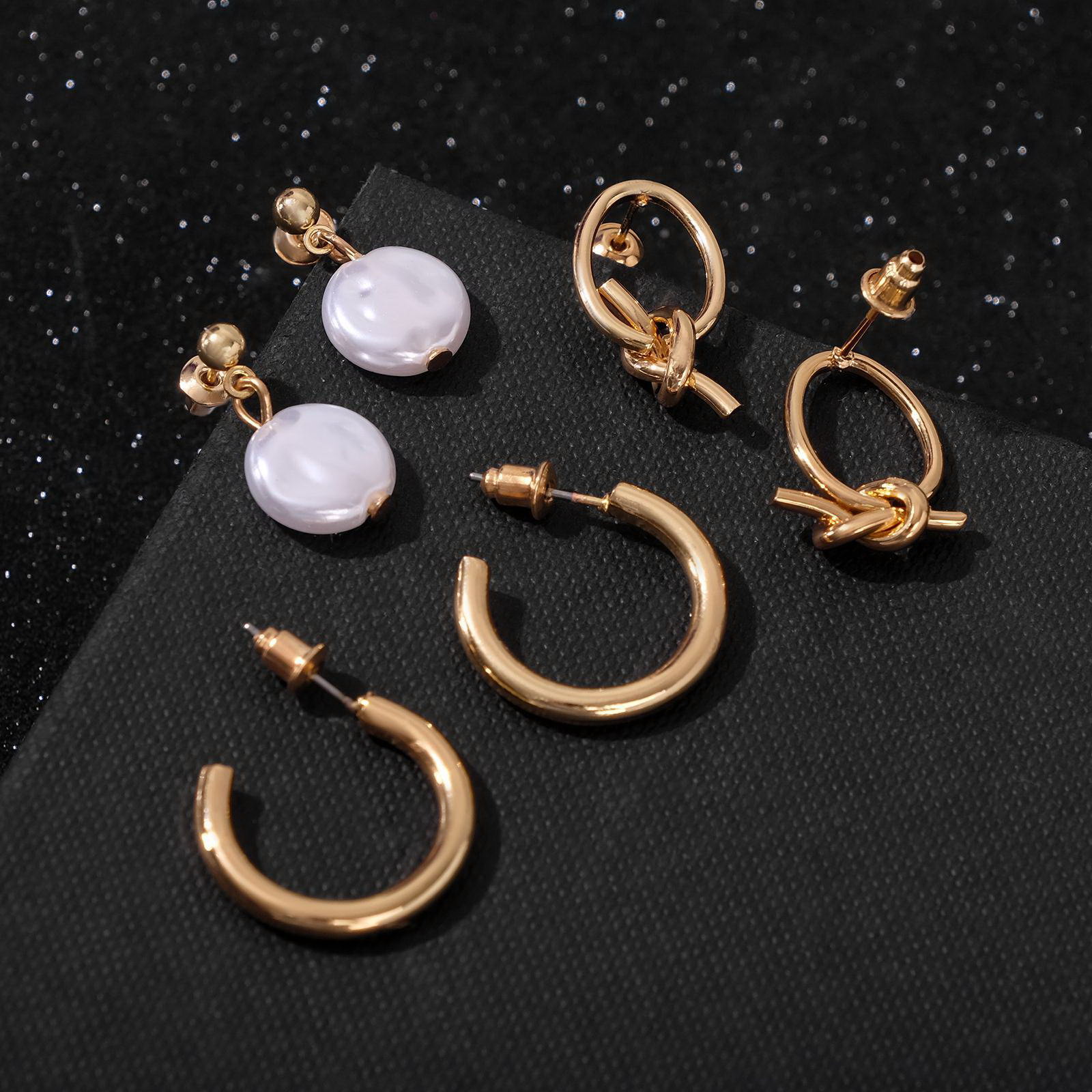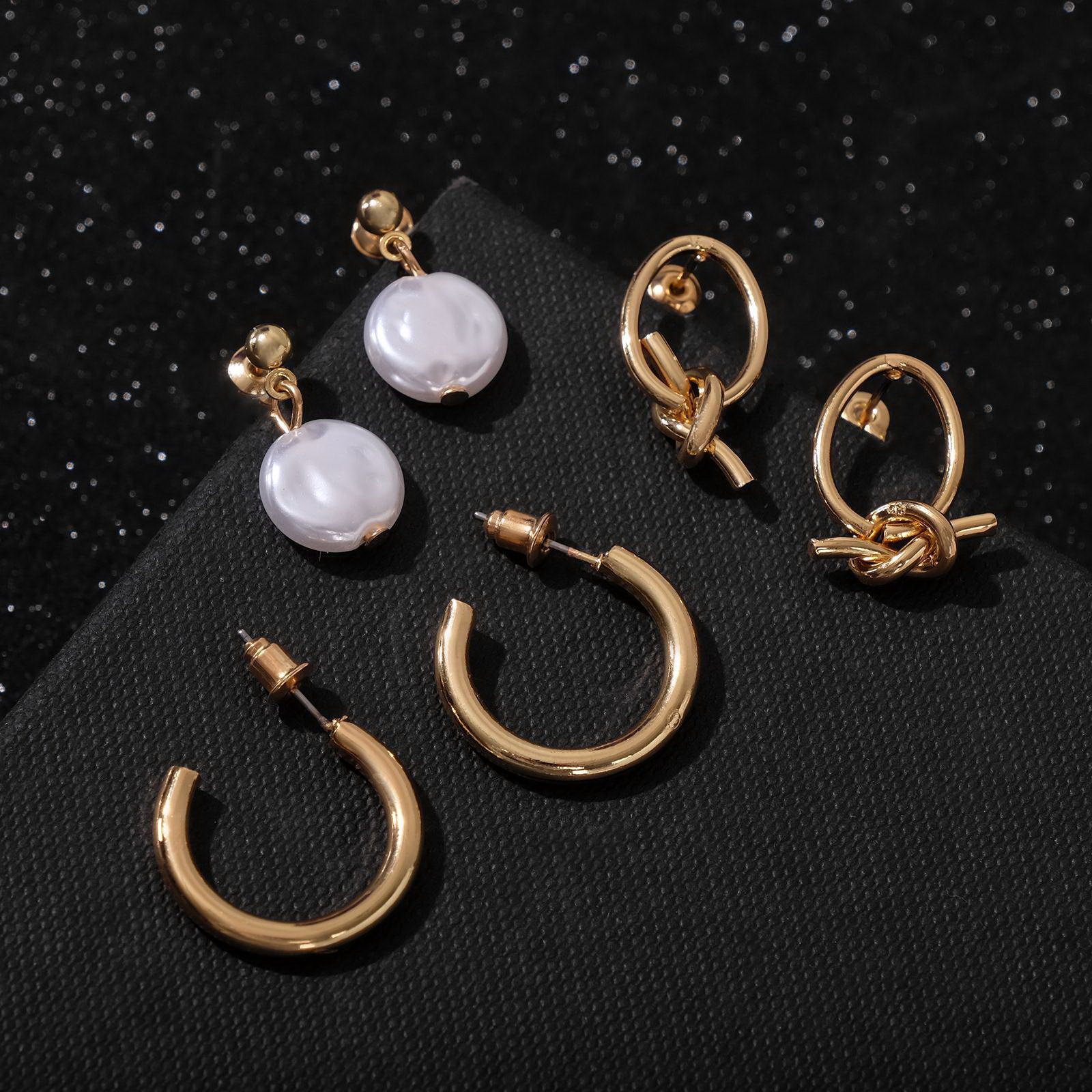 Серьги набор 3 пары "Юность" узел с жемчугом, цвет белый в золоте, d=2.3, 2.3x2.3x0.5 см., Китай