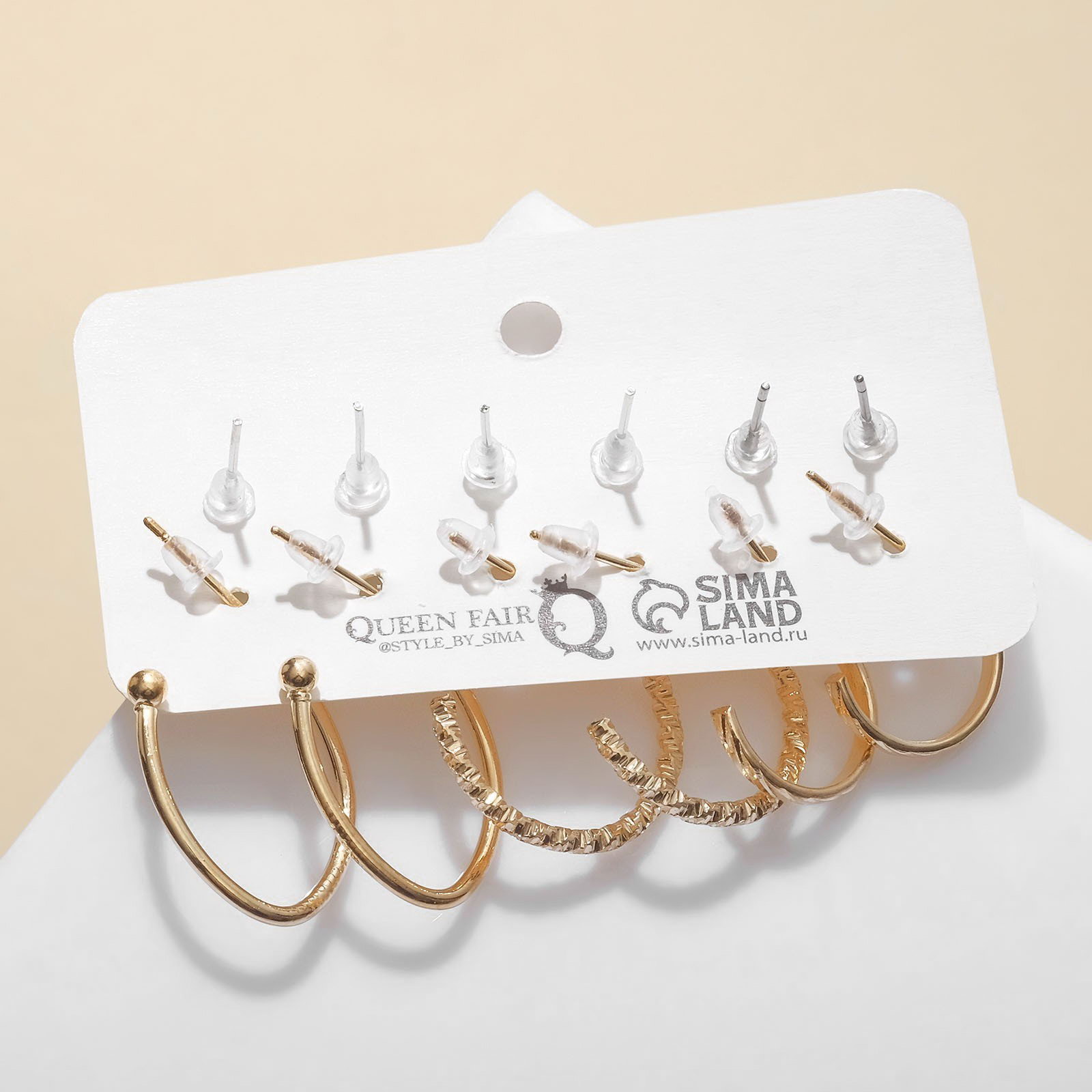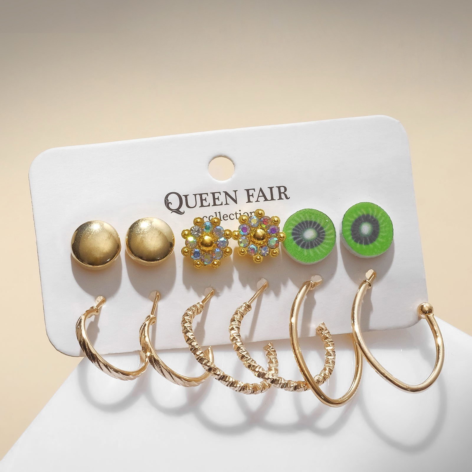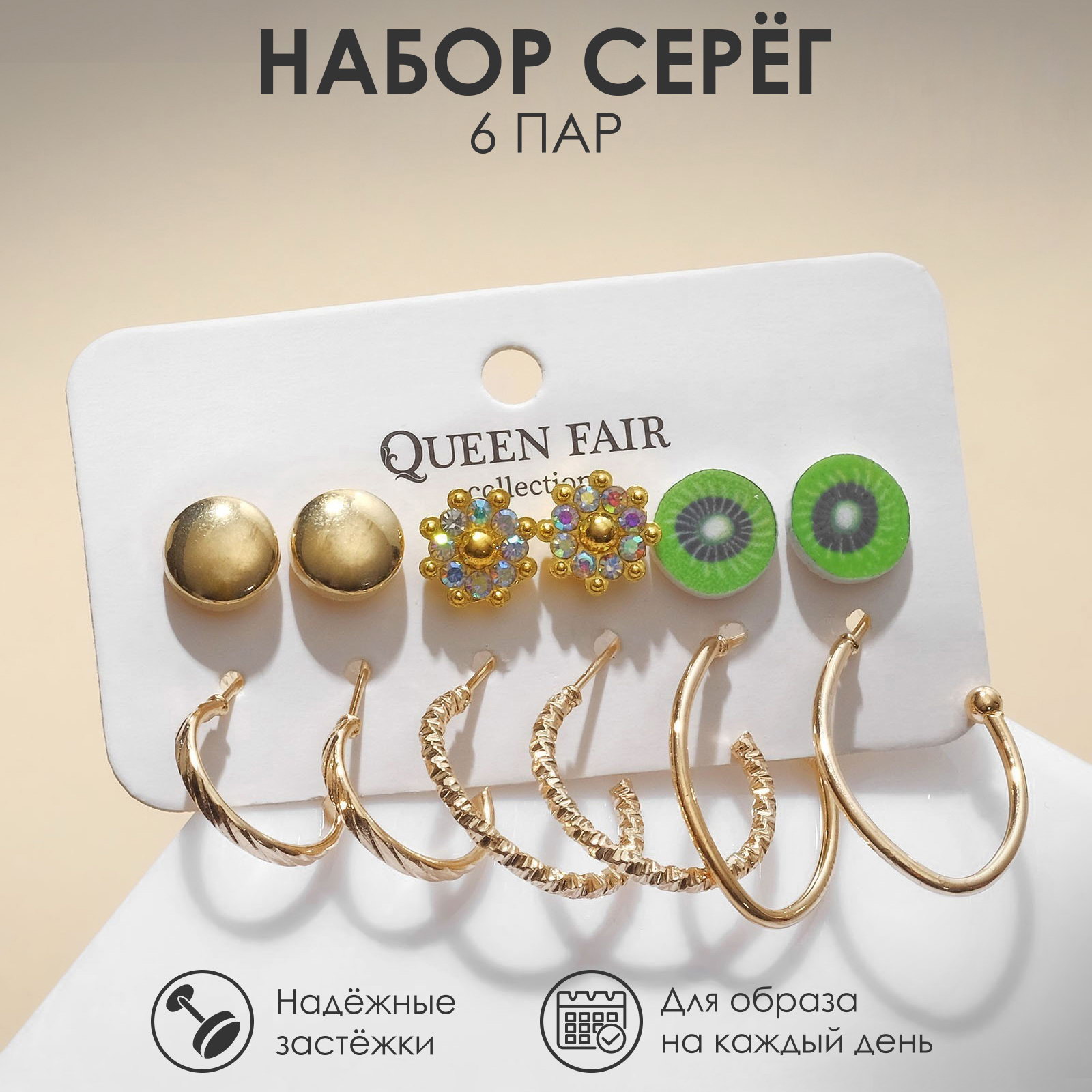 Набор серьги 6 пар "Ассорти" киви с цветком, цвет бело-зелёный в золоте, 0.9x2.5x1 см., Queen fair, Китай