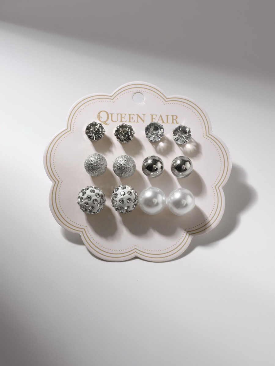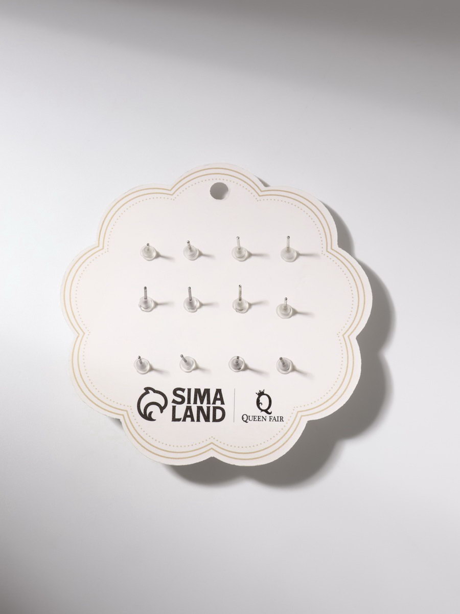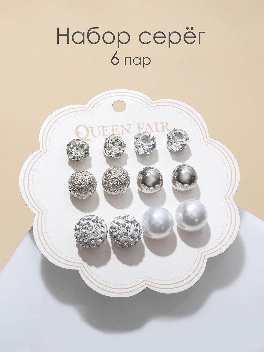 Серьги пусеты "Жемчужные", 6 пар, минимал d=8-11 мм, белые в серебре, 0.8x1.1x1 см., QF, Китай