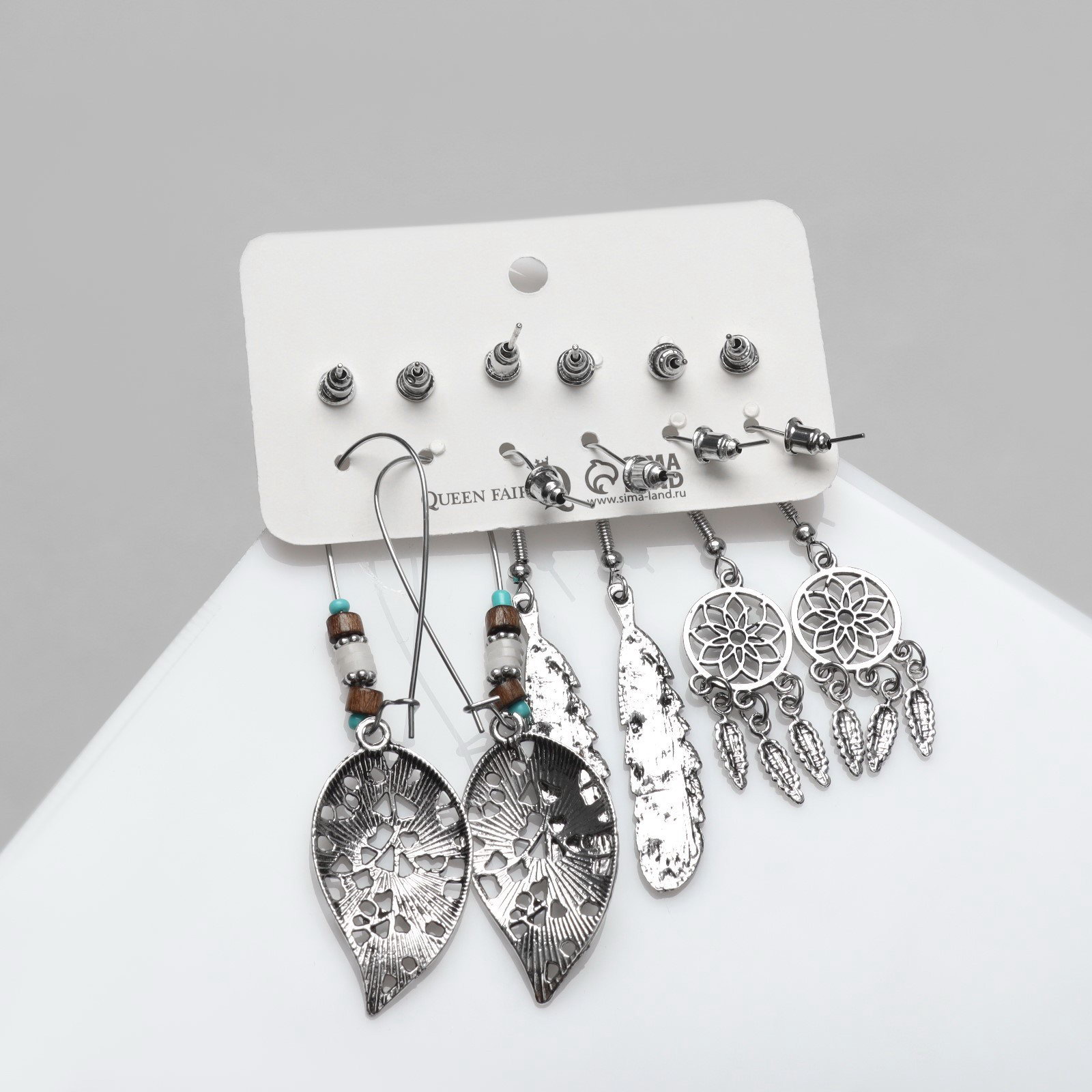 Набор серег "Хиппи", 6 пар, ловец снов, цветные в чернёном серебре, 2x7x1 см., QF, Китай