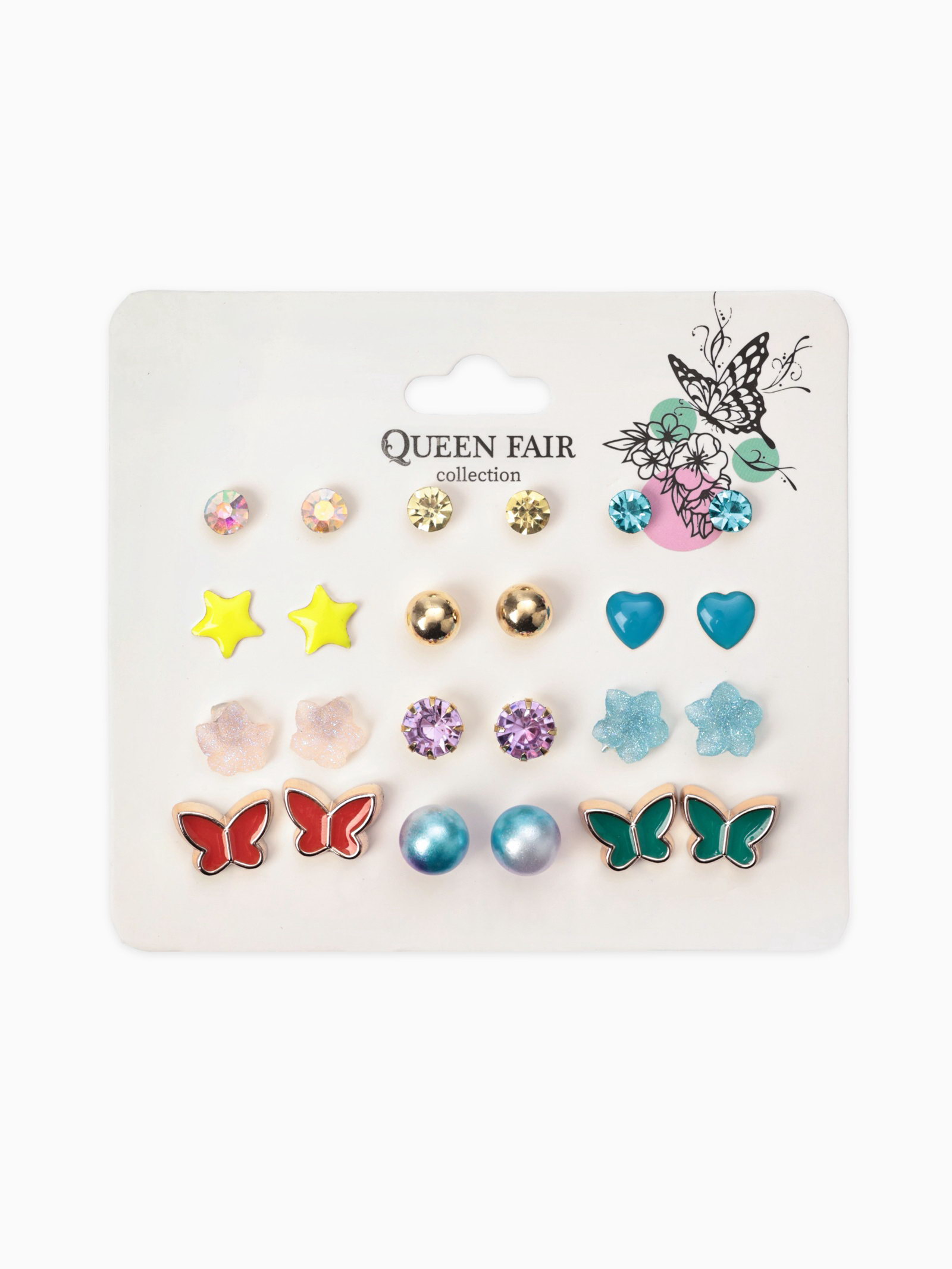 Серьги пусеты "Принцесса", 12 пар, бабочки, цветные в золоте, 1x1x0.4 см., QF, Китай