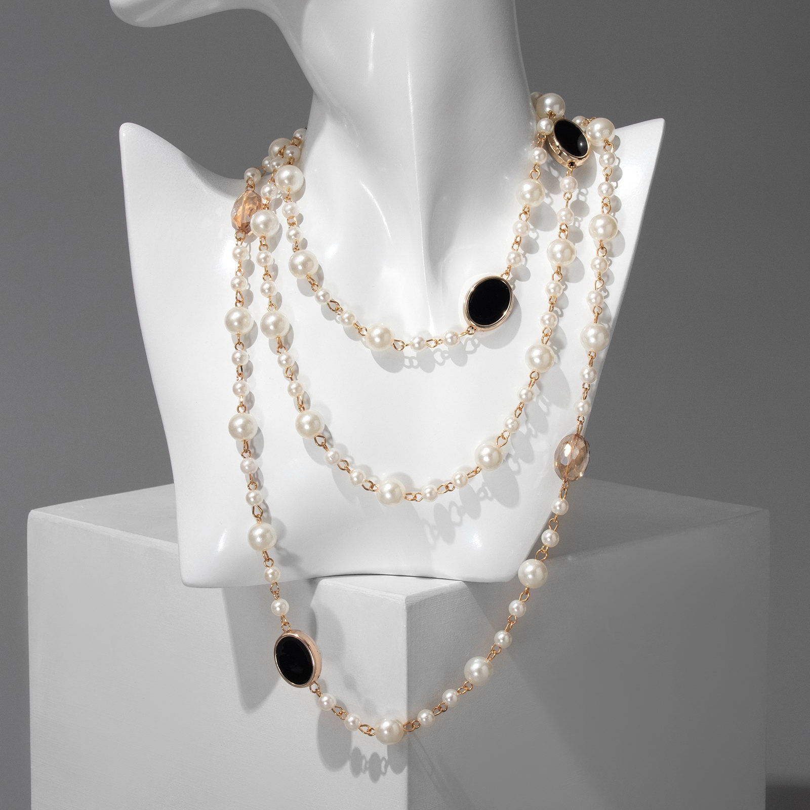 Бусы с жемчугом "Галантность" шар №6.10, чёрно-белые в золоте, L=50 см, 1.5x150x1 см., QF, Китай