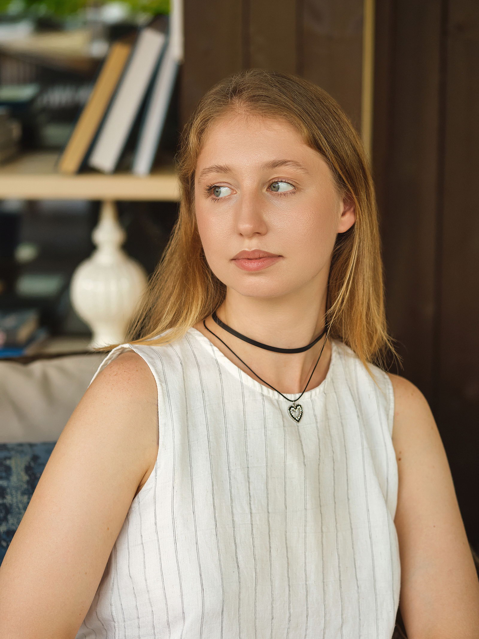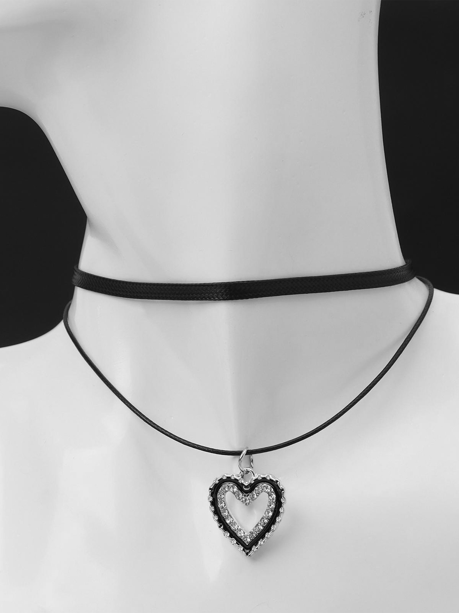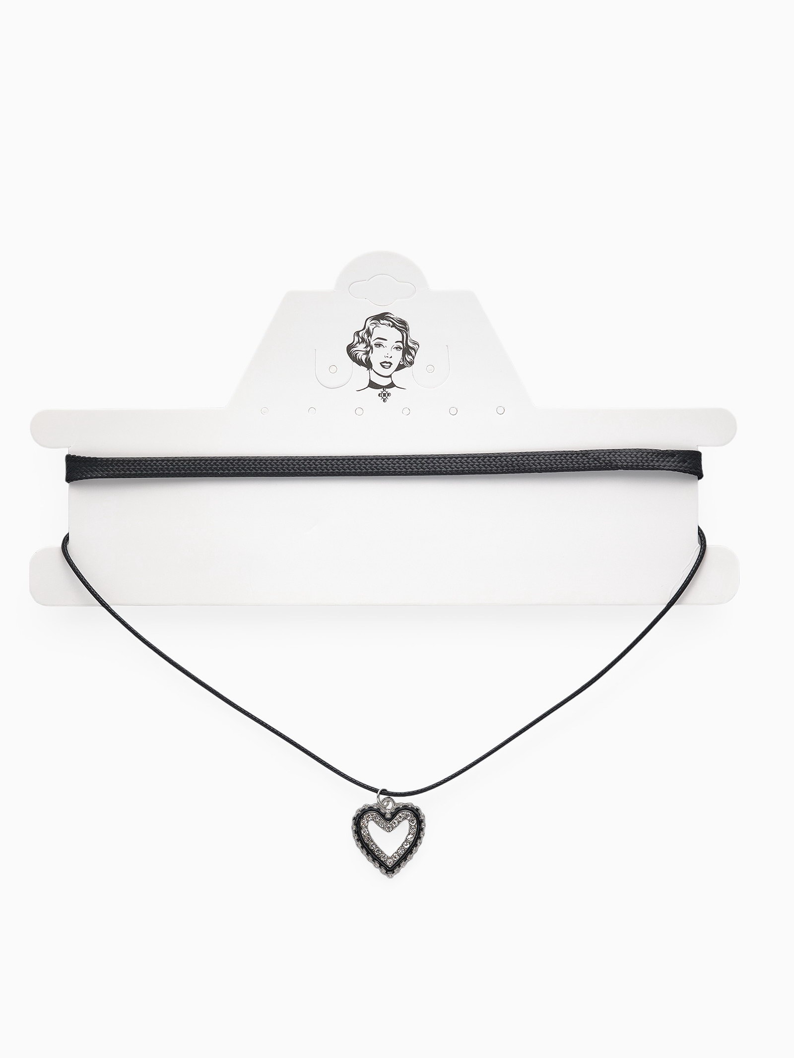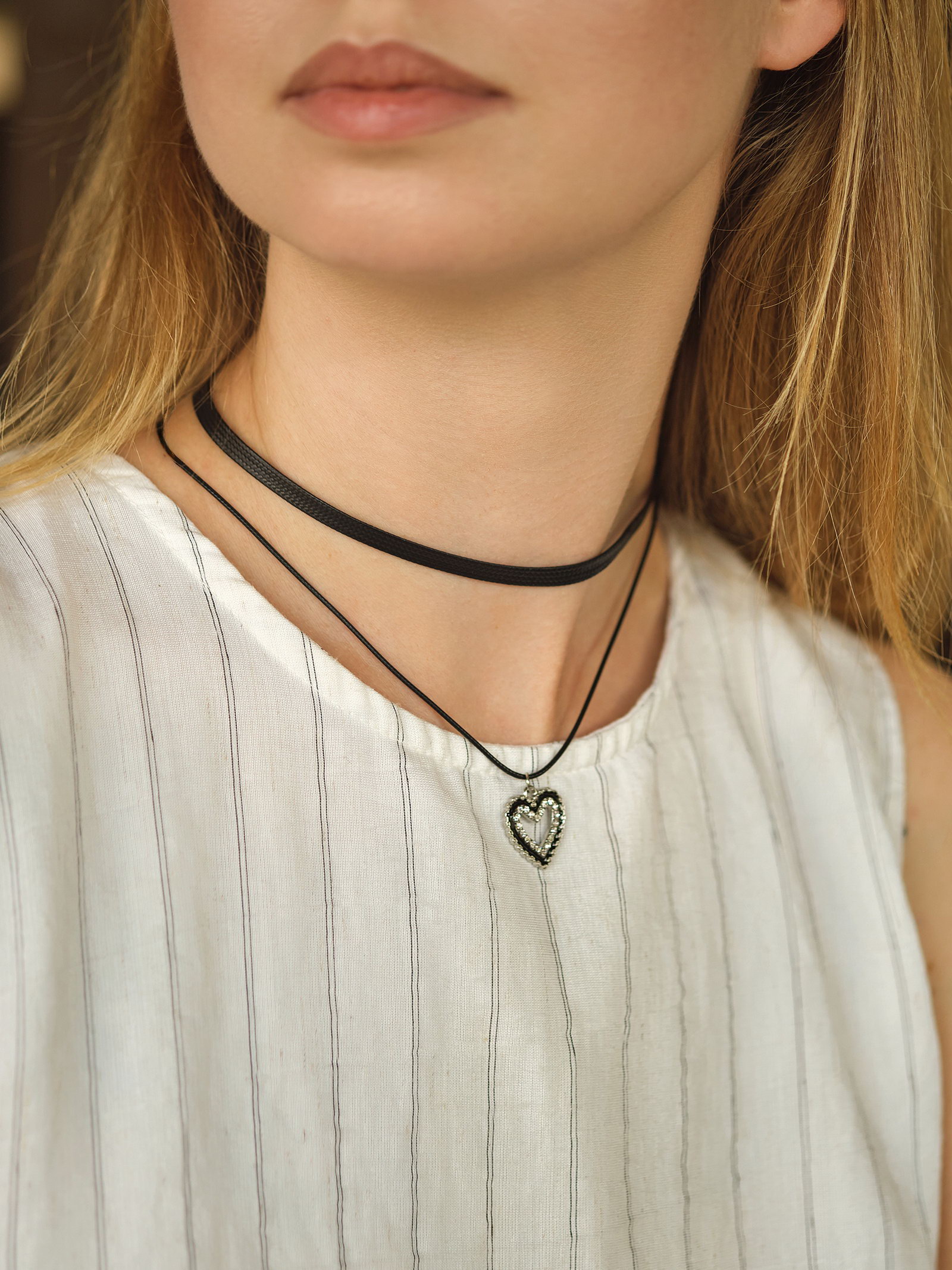 Чокер "Двойной" с нитью, сердечко, цвет бело-чёрный в серебре, L=32 см, 2x32x2 см., QF, Китай