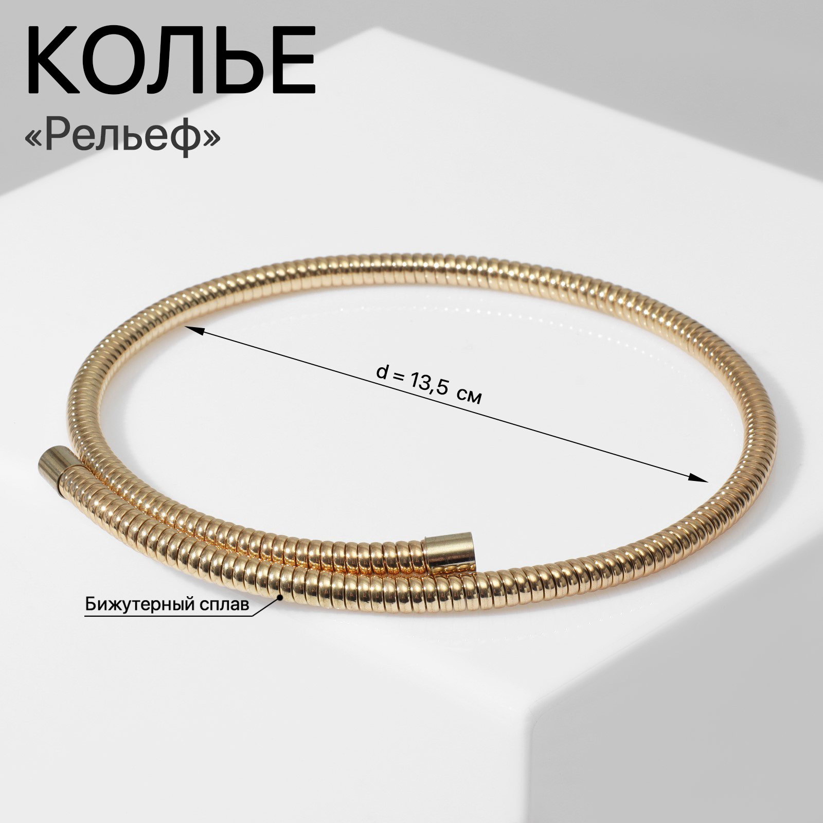 Вид: Колье, Колье, Чокер-цепь Тематика праздника: 8 Марта, День рождения, Универсальная тематика Размер упаковки: 14 x 1 x 14 см. Цвет: Золотистый Длина, см: 13.5 Вставка/Подвеска: Без вставок Цвет фурнитуры: Золотой Количество нитей: 1 Набор: Нет Материал основы: Металл Для кого: Для женщины Материал основания: Металл Тематика подарка: Бижутерия tnved: 7117190000 С подвеской: Нет Тематика: Минимализм Многослойное украшение: Нет Золотистое тонкое колье с рельефной текстурой и диаметром 13,5 см утончённый аксессуар для женщин, подчёркивающий изящность шеи и дополняющий любой образ. Минималистичный дизайн на металлической основе создаёт лёгкий акцент, подходящий для повседневной носки и особых случаев. Особенности