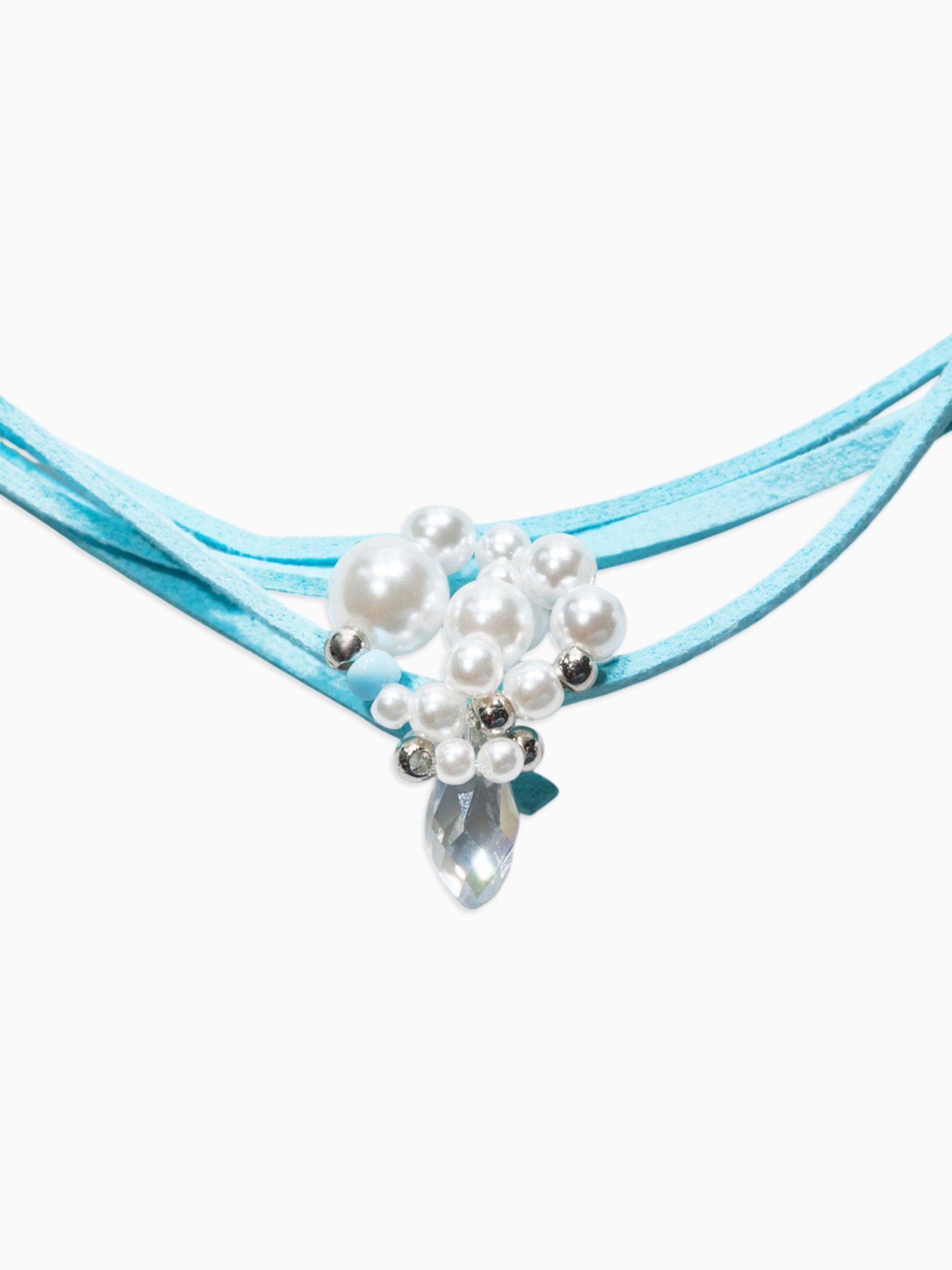 Чокер на шнурке с подвеской "Жемчуг с кристаллом", L=150 см, белый, голубой в серебре, 2x150x1 см., QF, Китай