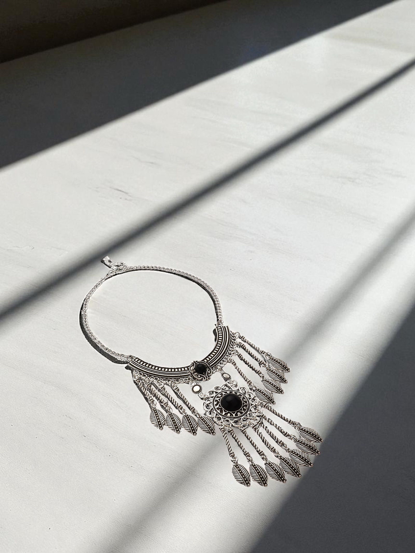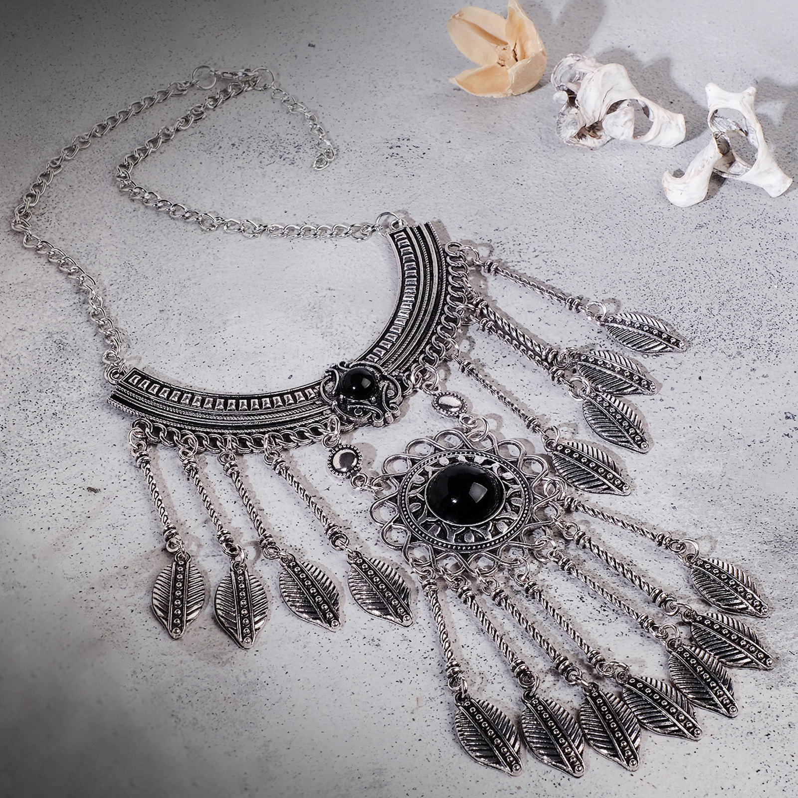 Колье "Ажурные перья" круг, чёрное в чернённом серебре, 35 см, 35x35x15 см., QF, Китай