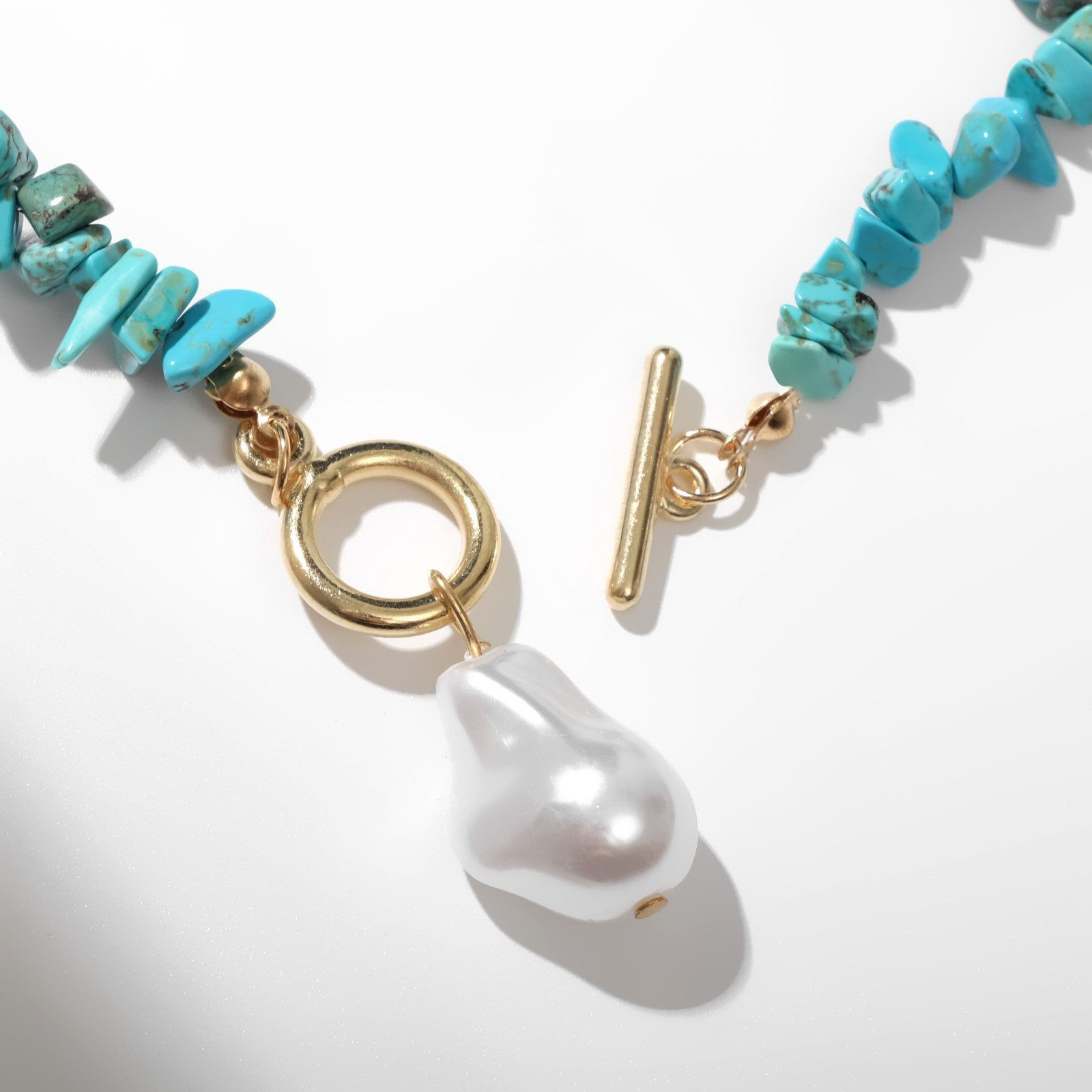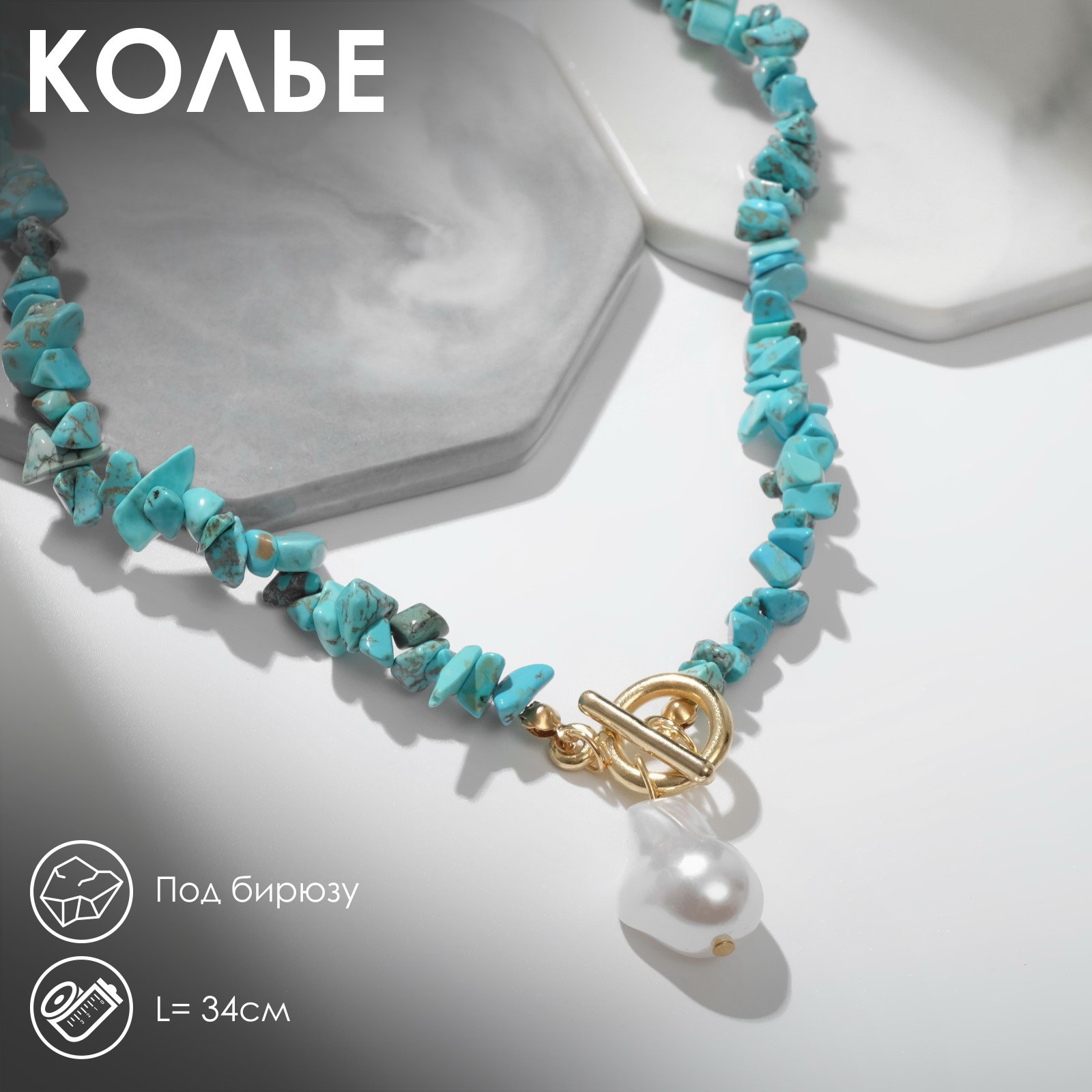 Колье жемчуг "Бирюза" капля, цвет бело-голубой в золоте, 34 см, 2.5x34x1.5 см., Queen fair, Китай