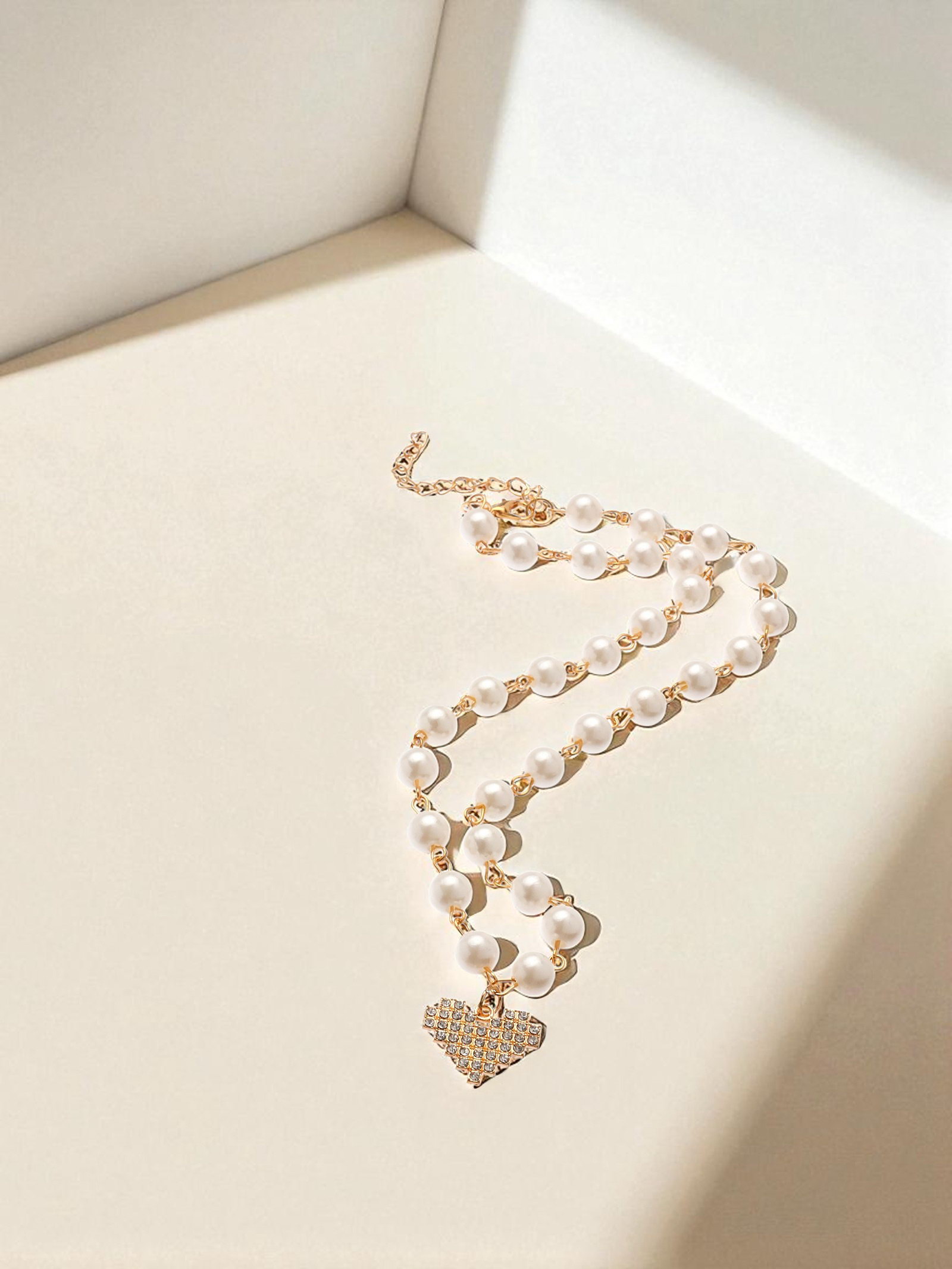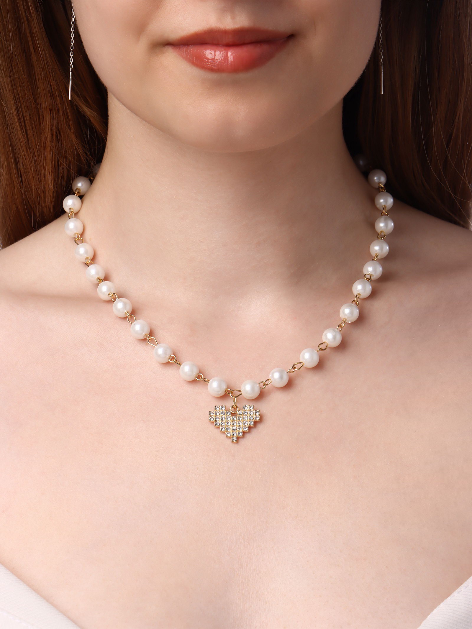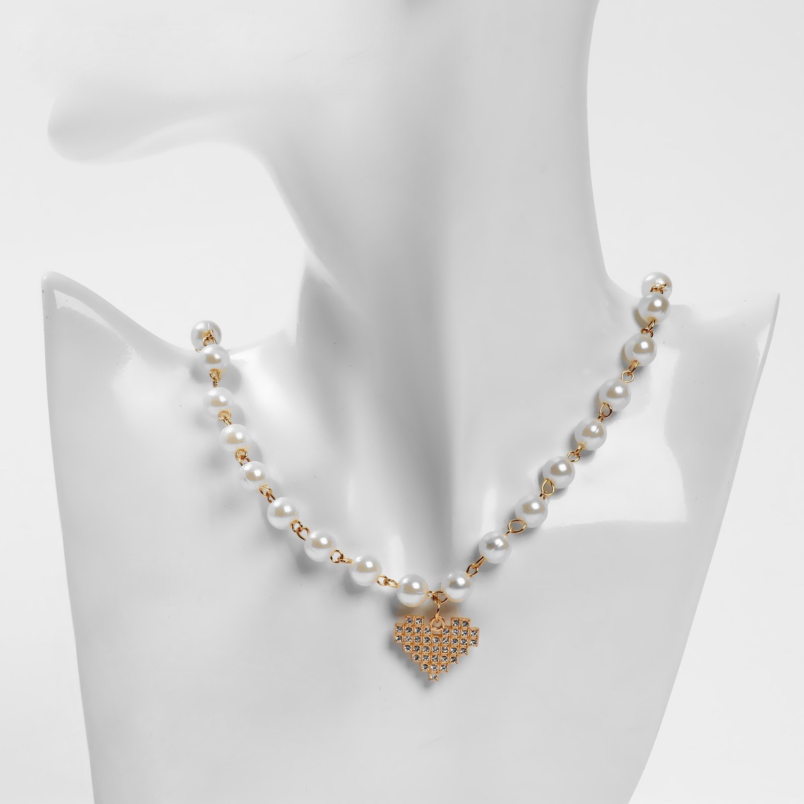 Колье с жемчугом "Сердце" квадратное, шар №6, белое в золоте, L=40 см, 1.2x40x2.5 см., QF, Китай