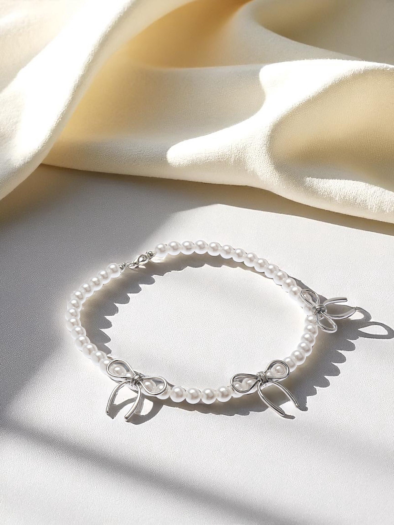 Колье "Бантик" с жемчугом, белое в серебре, 1.5x32x1.5 см., QF, Китай