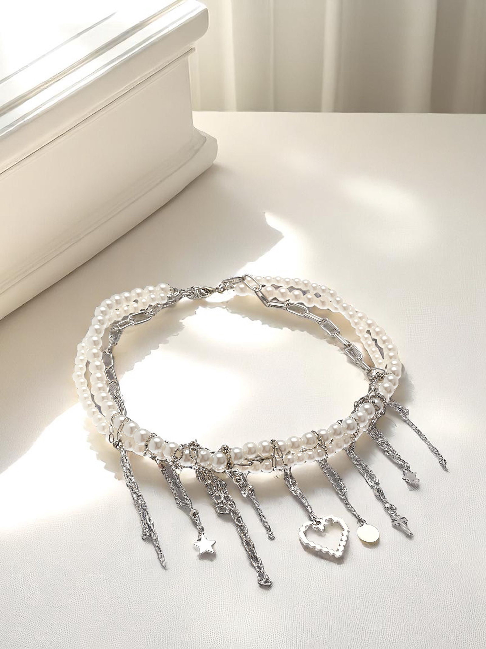 Колье "Многослойность" жемчужное, белое в серебре, 1.5x32x1 см., QF, Китай