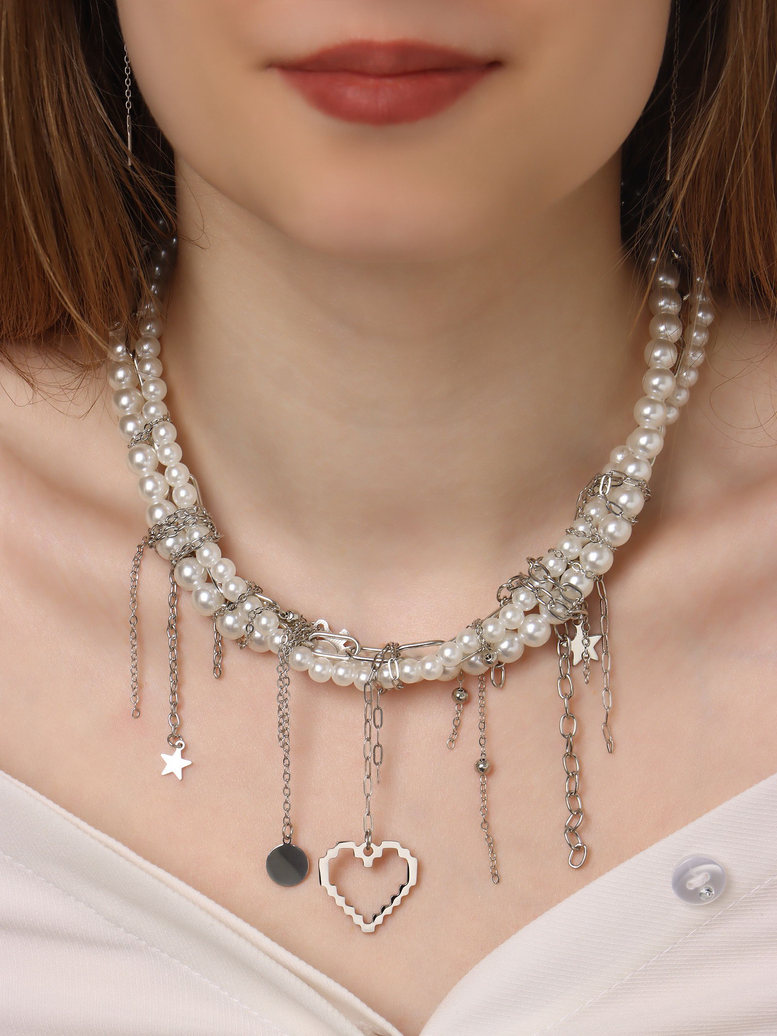 Тематика: Жемчужная, Сердце, Цепь Размер упаковки: 9 x 1 x 20 см. tnved: 7117190000 Цвет: Белый Вставка/Подвеска: Металл Для кого: Для женщины Длина, см: 32 Цвет фурнитуры: Серебряный Коллекция: Жемчуг Материал основы: Пластик Набор: Нет С подвеской: Да Многослойное украшение: Да Многослойное колье в нежном белом оттенке с жемчужным эффектом и серебристой фурнитурой воплощение изящества и современного стиля. Длина 32 см подчёркивает линию шеи, создавая лёгкий, воздушный образ, который гармонично впишется как в повседневный, так и в праздничный гардероб. Изготовленное из качественного пластика, украшение отличается лёгкостью и комфортом при ношении, а многослойная конструкция придаёт изделию объём и динамичность. Металлические вставки серебристого цвета добавляют благородства и подчёркивают утончённость дизайна, делая колье универсальным аксессуаром для женщин, ценящих стиль и элегантность.