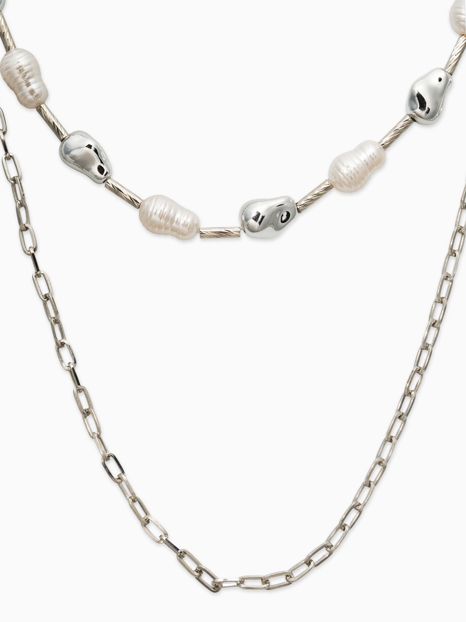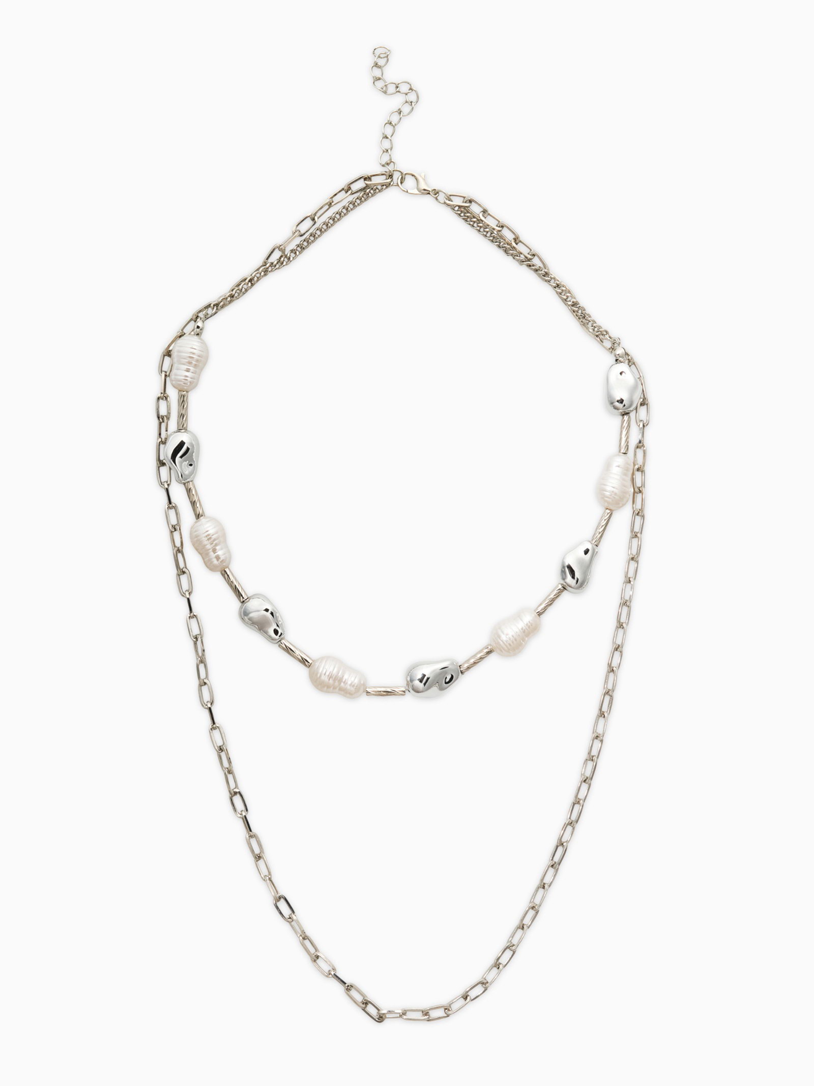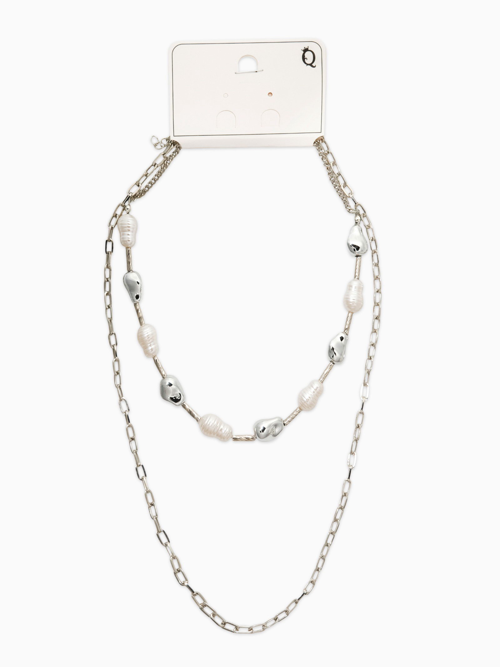 Колье цепочка "Жемчуг барокко", удлиненное, 2 яруса, белое в серебре, 1.5x55x1.5 см., QF, Китай