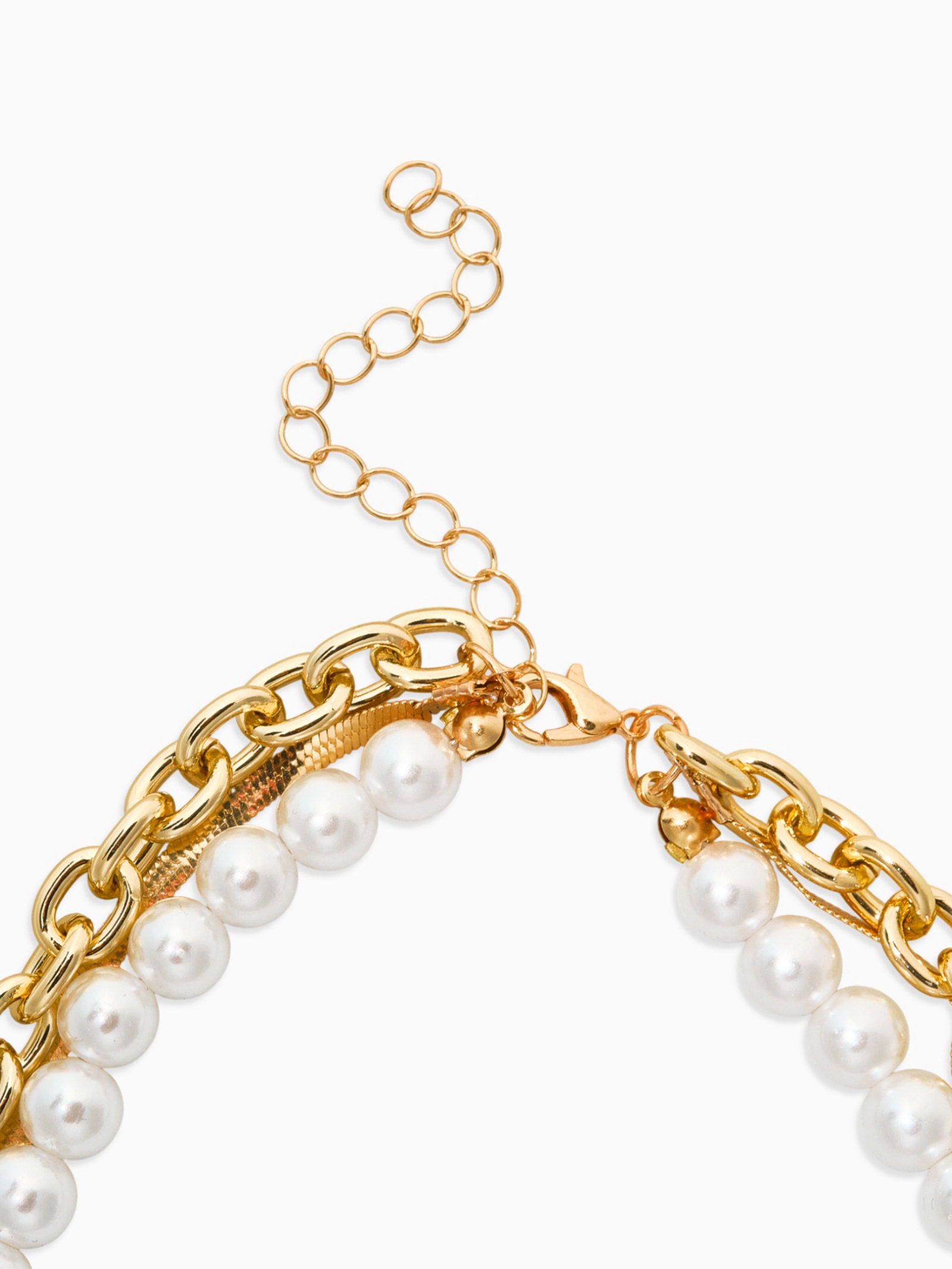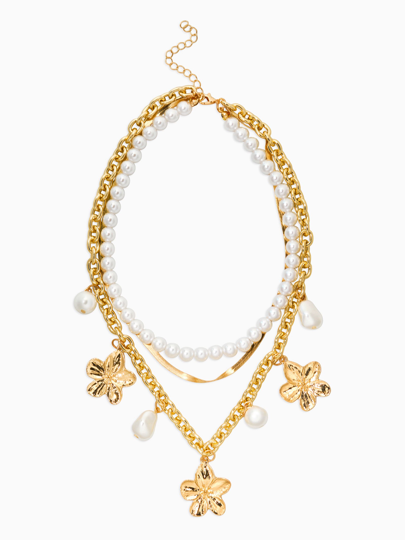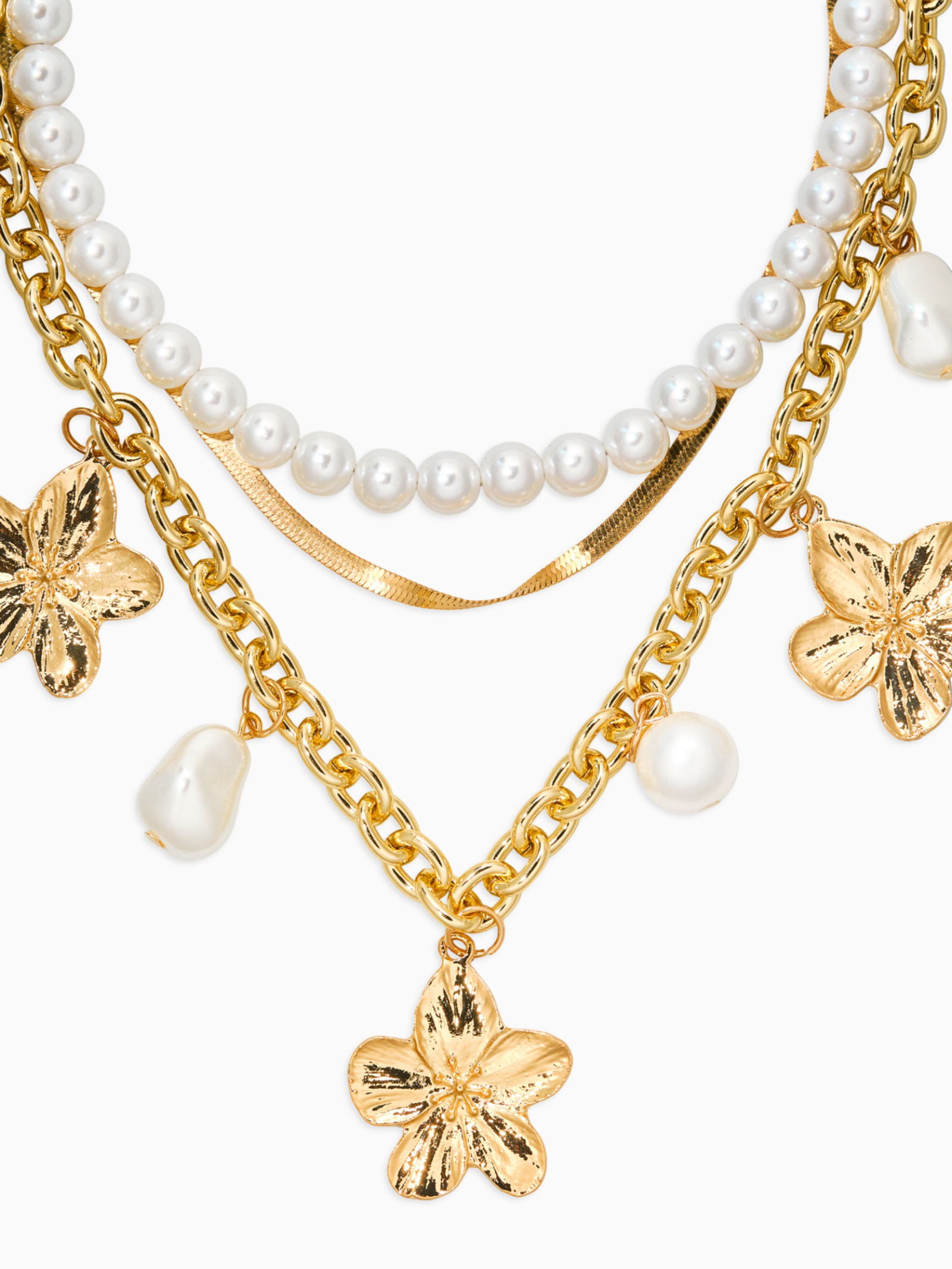 Колье многослойное с подвесками "Жемчуг с цветами", 3 уровня, 34, 36, 40 см, медь, белое в золоте, 3.2x40x2.5 см., QF, Китай