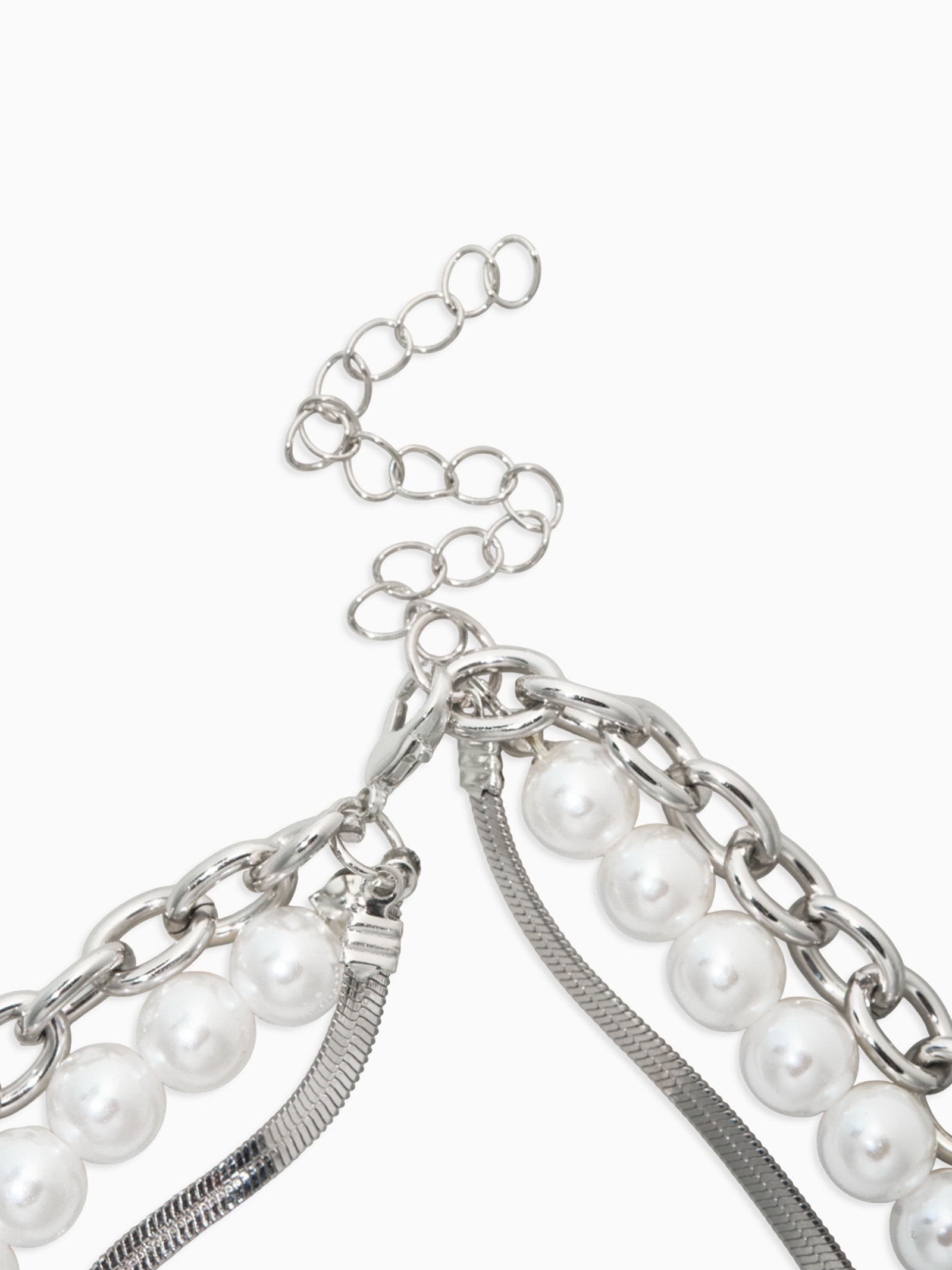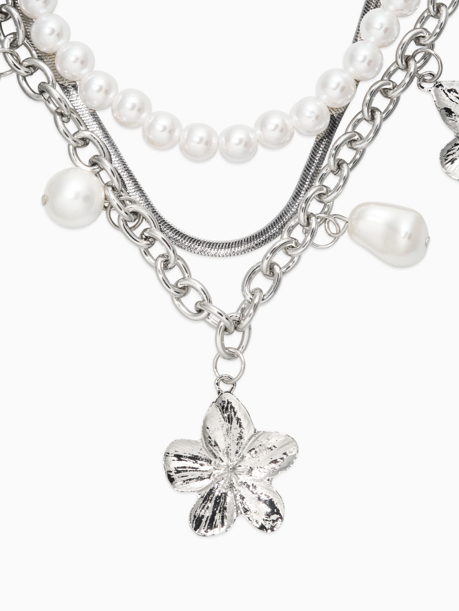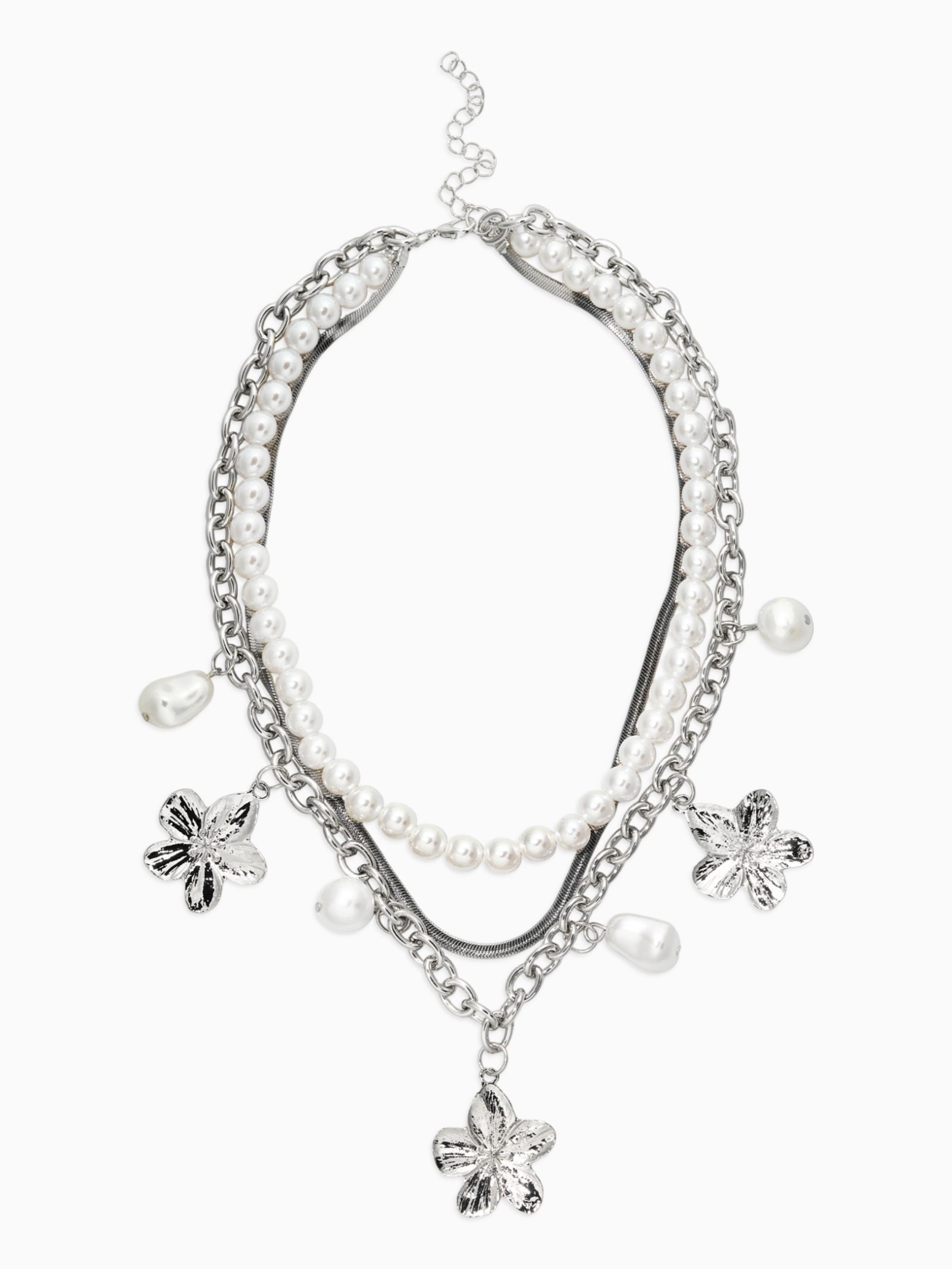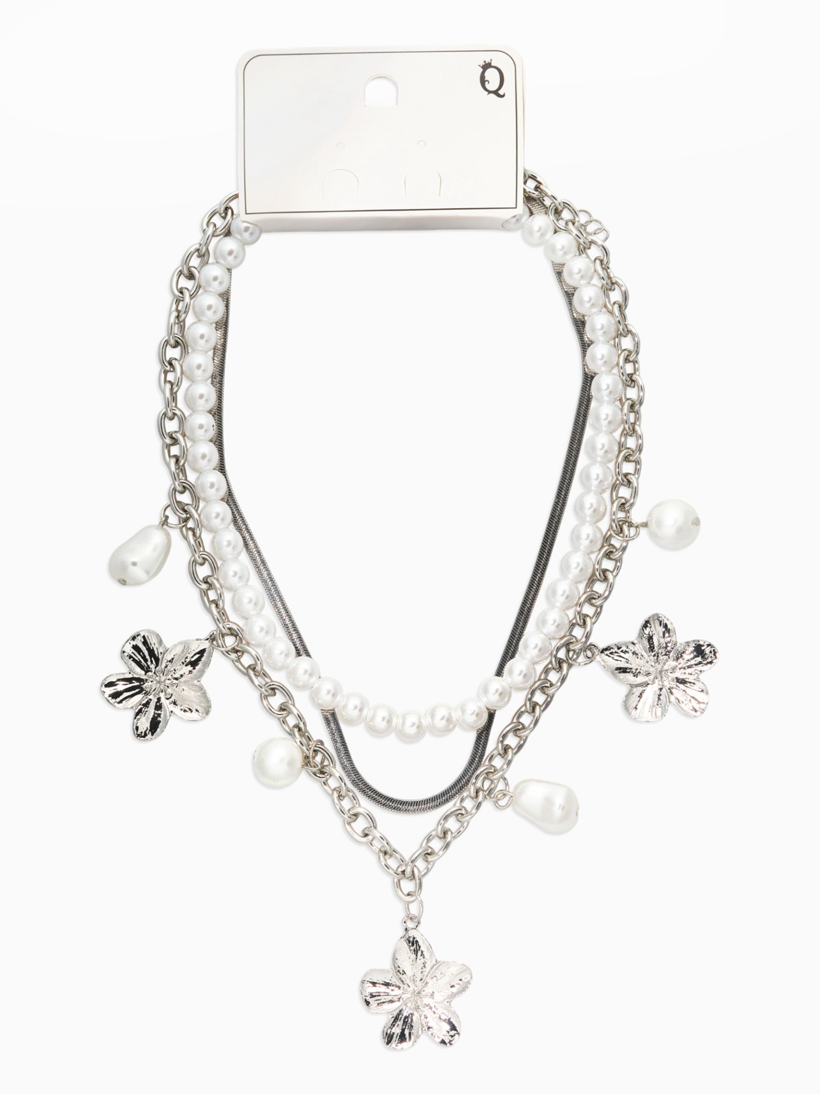 Колье многослойное с подвесками "Жемчуг с цветами", 3 уровня, 34, 36, 40 см, медь, белое в серебре, 3.2x40x2.5 см., QF, Китай